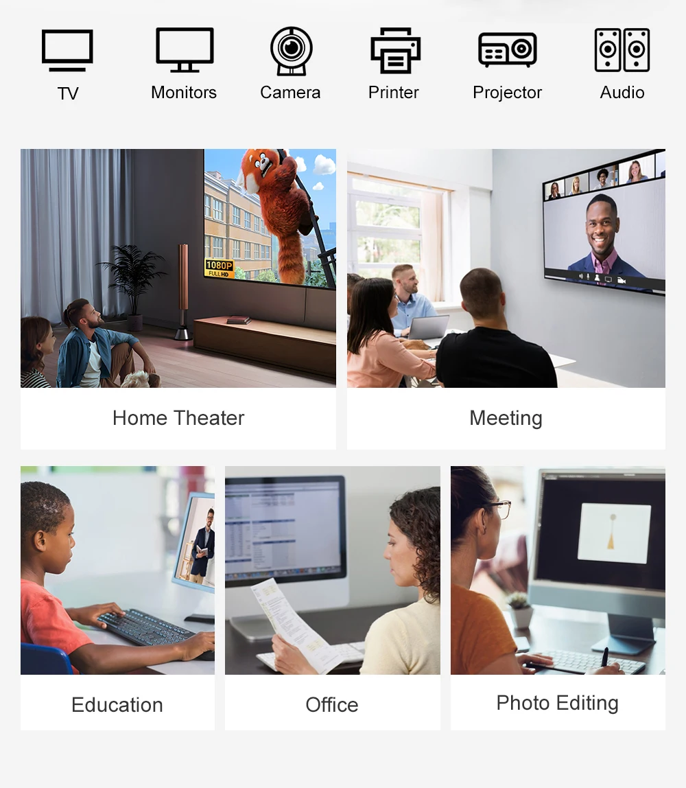Conéctese sin problemas aTelevisores, monitores, cámaras, impresoras, proyectores y dispositivos de audiopara una variedad de usos, incluidoscine en casa, reuniones, educación, tareas de oficina y edición de fotografías., asegurando un rendimiento fluido en todos sus dispositivos.