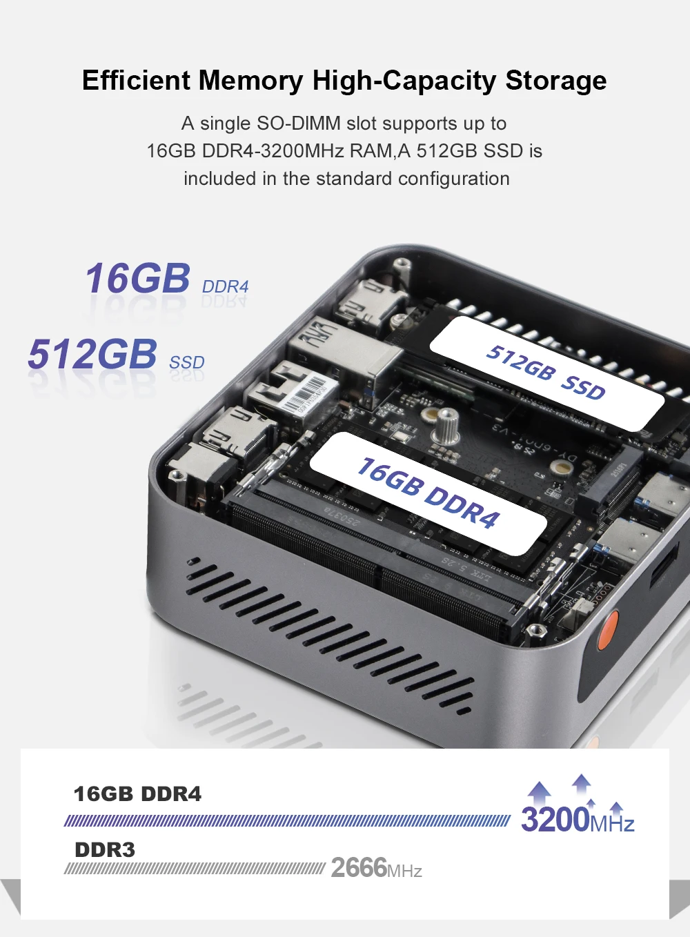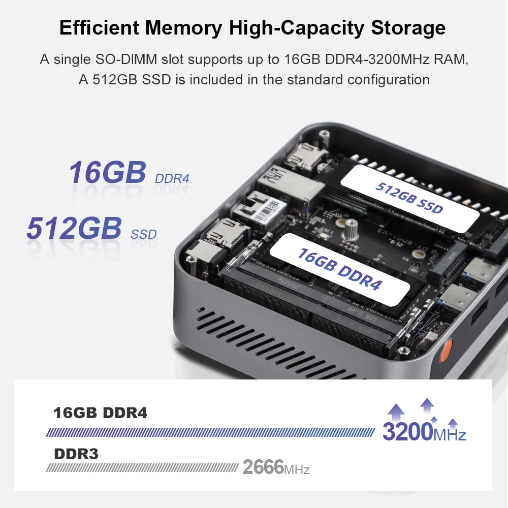 Equipado con una única ranura SO-DIMM que admite hasta 16 GB de RAM DDR4-3200 MHz, este sistema garantiza una multitarea fluida y un rápido acceso a los datos.El SSD de 512 GB incluido en la configuración estándar ofrece tiempos de arranque rápidos y un amplio espacio para sus archivos, aplicaciones y proyectos, lo que equilibra perfectamente el rendimiento y el almacenamiento.