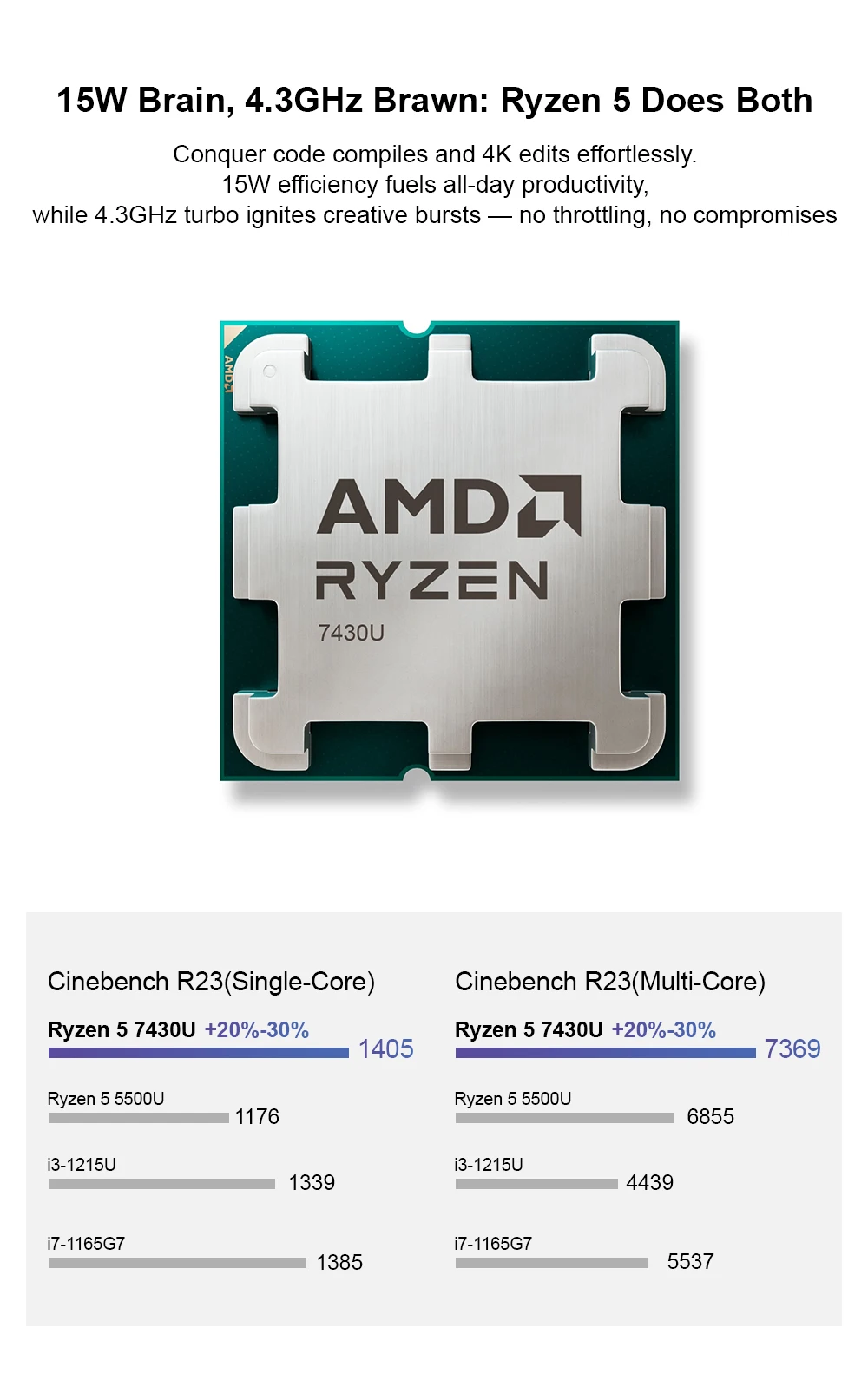 ⚡ Cerebro de 15 W, 4,3 GHz coronado: alimentado por AMD Ryzen 5