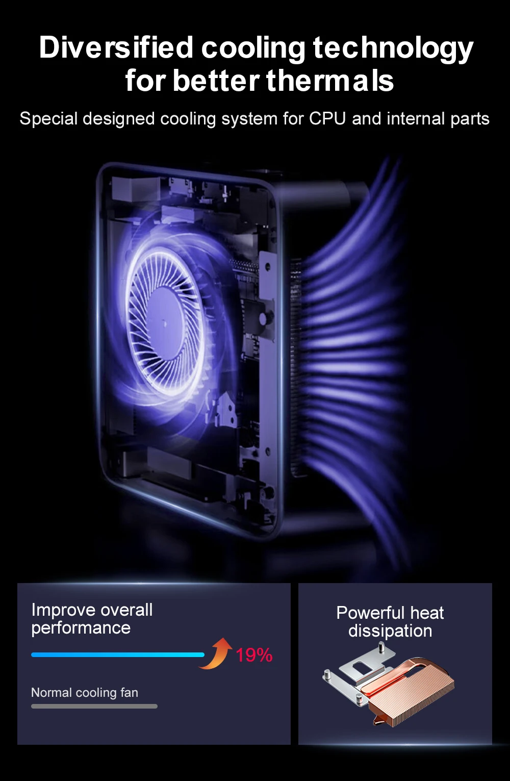 Disipación de calor inteligente: el sistema de enfriamiento activo del ventilador inteligente se adopta para mantener el rendimiento de enfriamiento del dispositivo bajo alta carga.