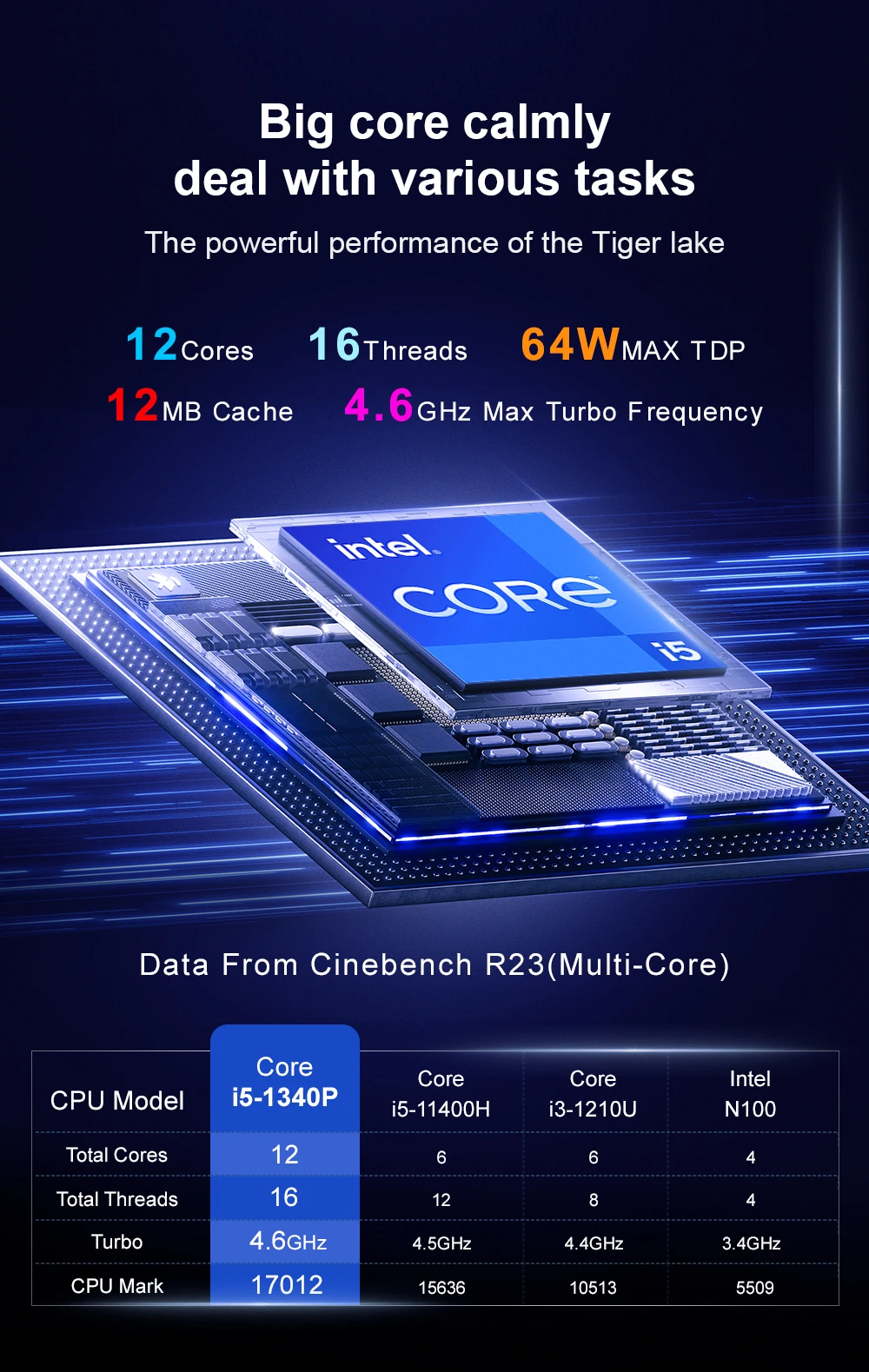 Núcleo potente: equipado con un procesador Intel 4,6, frecuencia turbo de hasta GHz, utilizando el proceso de litografía Intel 7, el consumo de energía es de solo 28W, equipado con la tarjeta gráfica Intel® Iris® Xe Graphics, la frecuencia de aceleración puede alcanzar los 1,45 GHz.