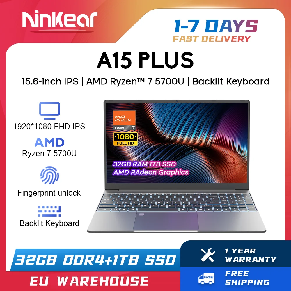 Comprar Ninkear-ordenador portátil A15 Plus AMD Ryzen™Teclado retroiluminado 7 5700U, 15,6 pulgadas, FHD, IPS, 60Hz, 32GB + 1TB, SSD, desbloqueo por huella dactilar, Notebook
