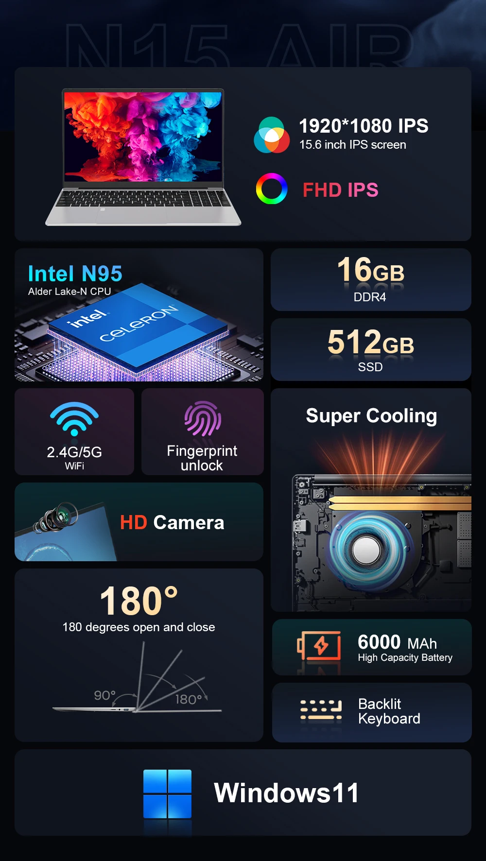 Comprar Ninkear-ordenador portátil N15 Air, Notebook con pantalla FHD de 15,6 pulgadas, IPS, 16GB, DDR4, 512GB, SSD, Intel N95, Teclado retroiluminado con desbloqueo de huellas dactilares, Windows 11