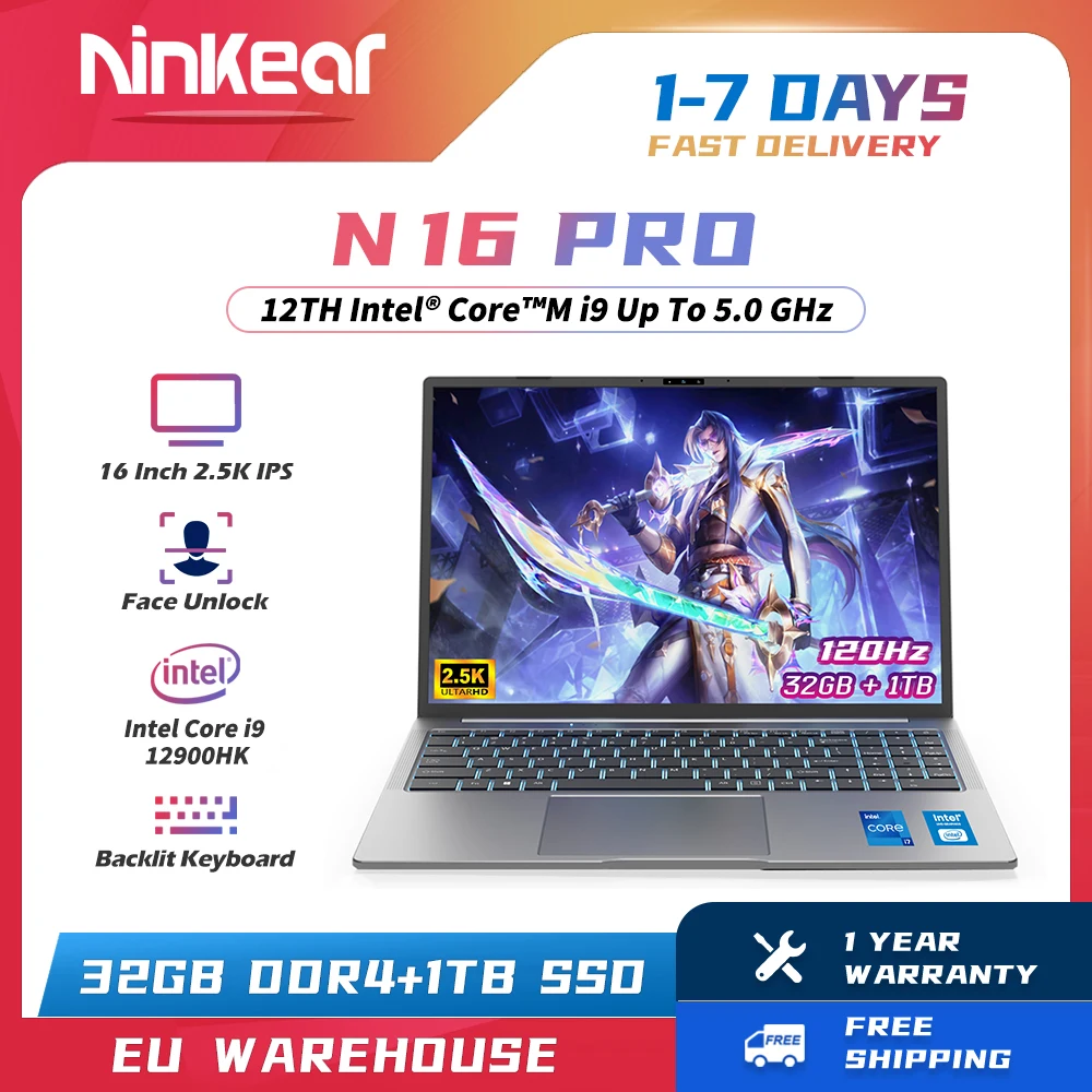 Comprar Ninkear-ordenador portátil N16 PRO para videojuegos, computadora con Intel i9-12900HX de 16 pulgadas, 2,5 K, IPS, 120Hz, 32GB, DDR4 + 1TB, SSD, WiFi, 6 reconocimiento facial