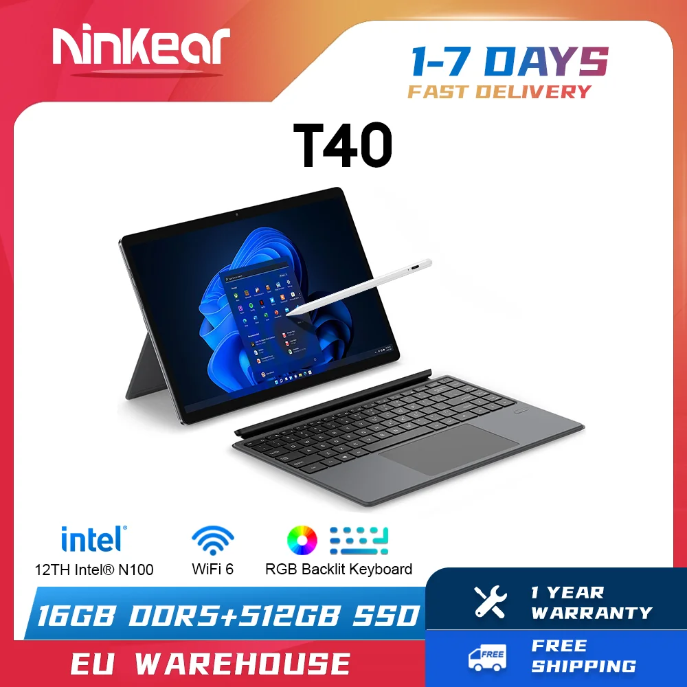 Comprar Ninkear-ordenador portátil T40 con pantalla táctil, Tablet 2 en 1, Intel N100, 14 pulgadas, FHD, 16GB, DDR5 + 512GB, SSD, Wifi, 6 RGB, Teclado retroiluminado con Stylus