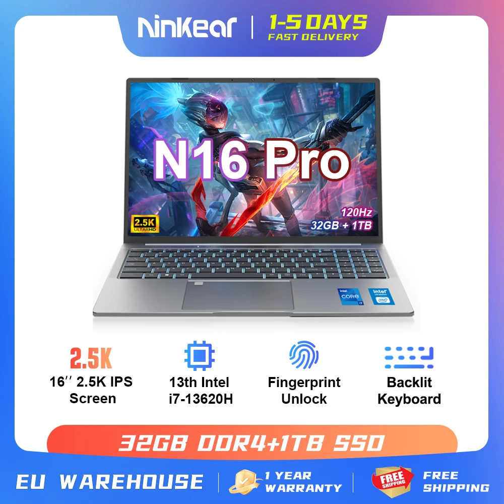Comprar Ninkear-ordenador portátil para videojuegos N16 PRO, 16 pulgadas, 13th Gen, Intel i7-13620H, 32GB, DDR4 + 1TB SSD, 2,5 K, IPS, 120Hz, desbloqueo facial, WiFi6