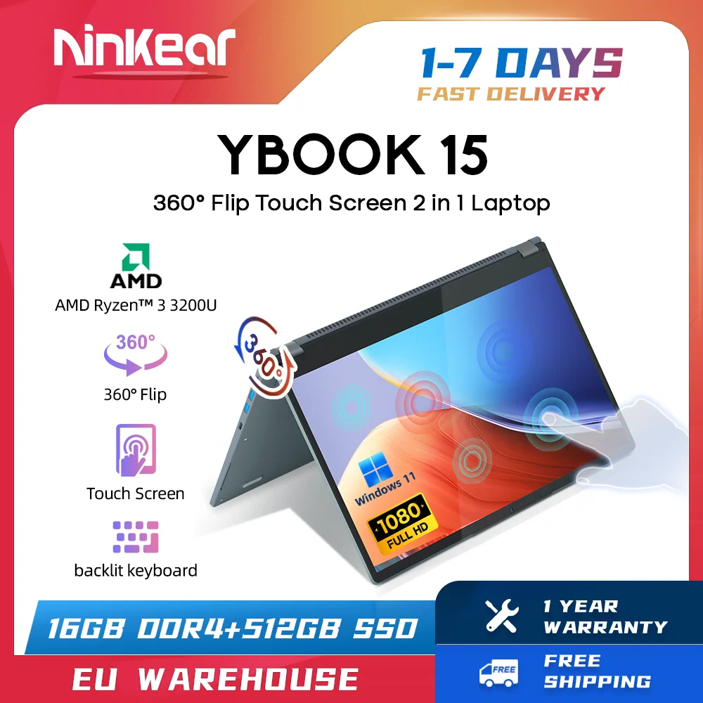 Comprar Ninkear-ordenador portátil YBOOK15, 2 en 1, AMD Ryzen™Teclado retroiluminado 3 3200U, pantalla táctil FHD IPS de 15,6 pulgadas, 360 °, 16 GB + 512GB SSD, Windows 11