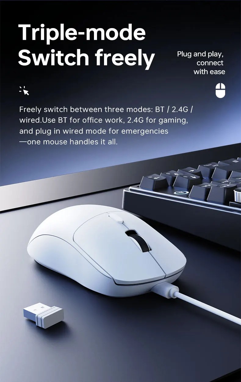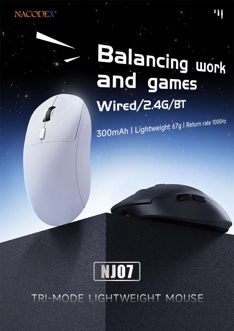 Experimente una conmutación perfecta con la conectividad de modo triple de NJ07, que admite opciones inalámbricas, Bluetooth y cableadas de 2,4 GHz para un uso versátil.