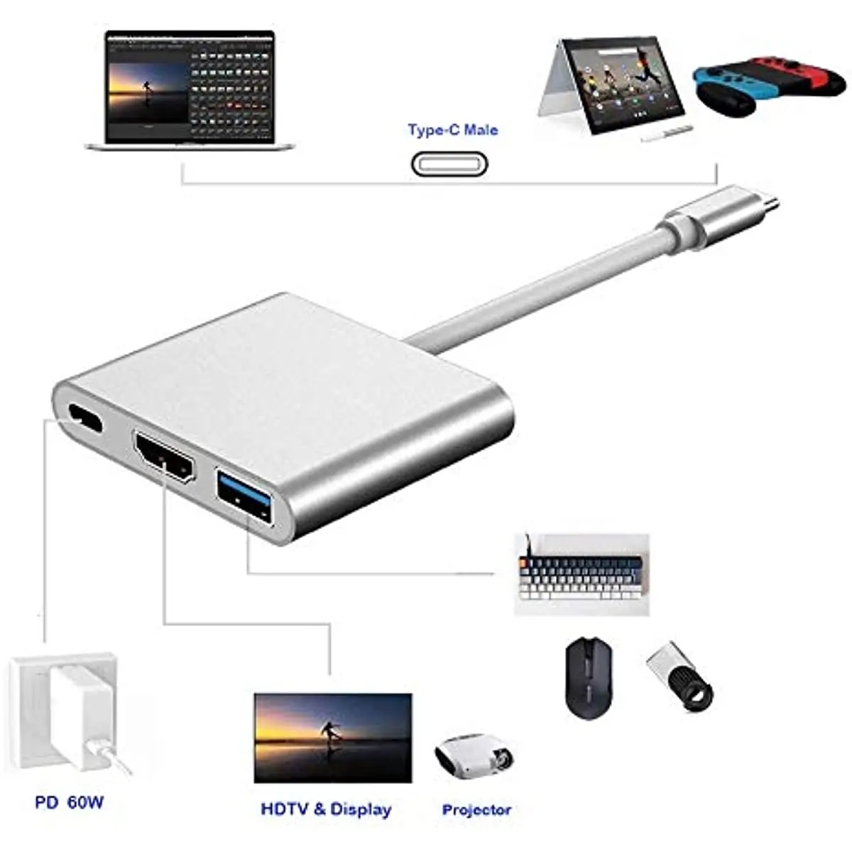 【Adaptador 3-en-1 para HDTV】 Adaptador multipuerto USB 3.1 Tipo-C a HDTV/1/USB 3,0 de tamaño pequeño, fácil de llevar en el bolsillo. Conveniente para el entretenimiento de cine en casa, oficina, presentación, exposición, enseñanza, etc. Ligero, plug and play, no se necesita Conductor Adicional