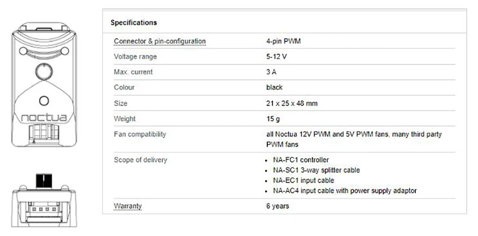El es un controlador compacto y altamente flexible para ventiladores PWM de 4 pines que puede funcionar por sí solo para la reducción de velocidad manual y también trabajar en conjunto con el control automático del ventilador de la placa base. Al ajustar el dial de control de velocidad del NA-FC1, los usuarios pueden configurar manualmente un ciclo de trabajo PWM de 0 a 100% o reducir el ciclo de trabajo PWM suministrado por las placas base de PC para que los ventiladores funcionen más lentamente de lo que permitiría el control automático del ventilador de la placa base. Mientras que el brillo del LED DE ESTADO naranja proporciona información visual sobre la configuración actual del dial, el botón pulsador permite cambiar el modo "sin parada" de la NA-FC1. que evita que el ventilador caiga por debajo de una velocidad de 300rpm. Gracias al cable dividido de 3 vías suministrado y al adaptador de fuente de alimentación, se pueden controlar hasta 3 ventiladores simultáneamente.