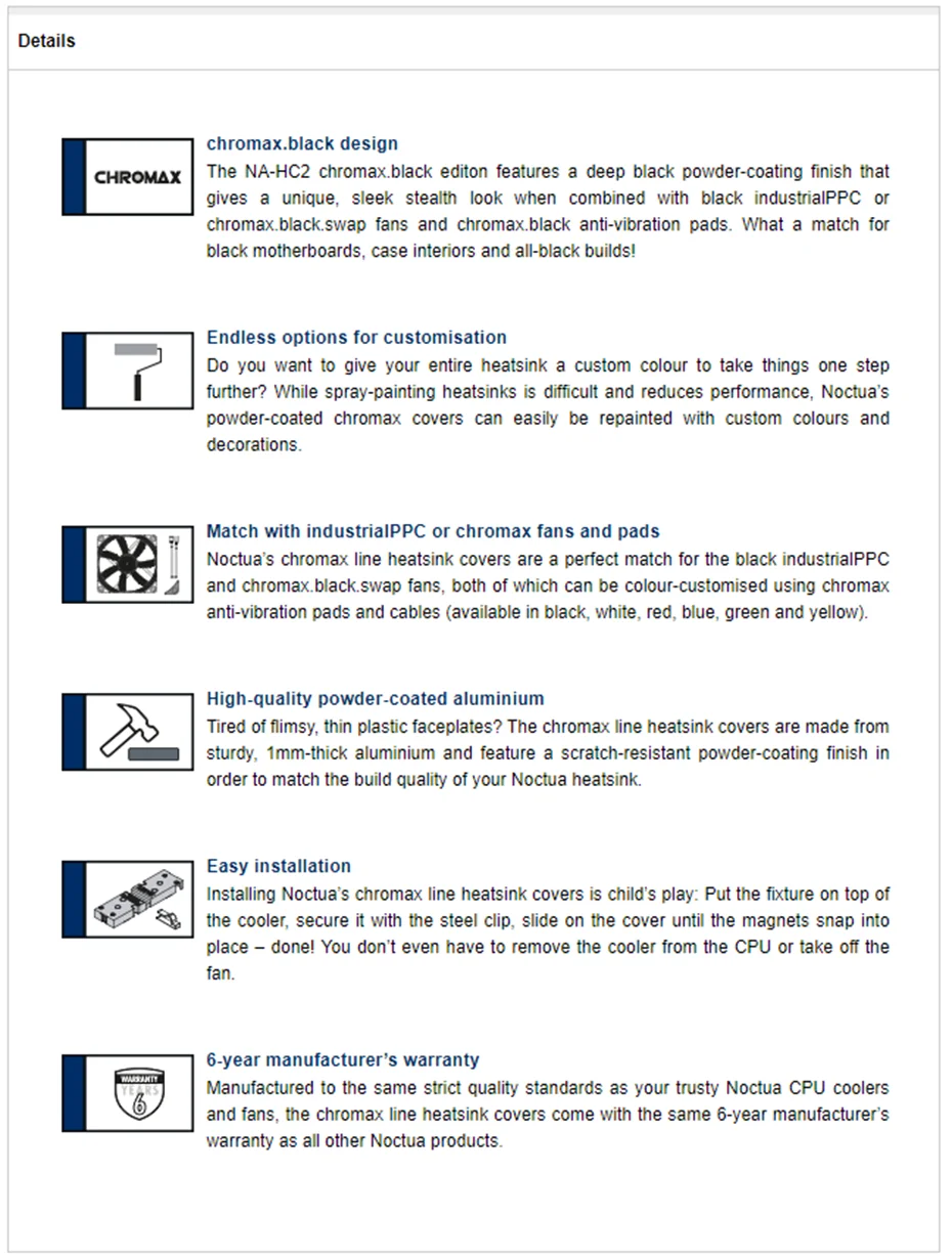 La cubierta del disipador de calor chromax.black es un accesorio adicional para los premiados enfriadores de CPU de Noctua, de la premiada, de la mano de la Noctua, de los que se pueden usar, de los que se incluyen los de la CPU, la de los que se han hecho los de Hecho de aluminio de alta calidad con acabado de recubrimiento en polvo negro, permite a los usuarios dar al refrigerador un aspecto elegante y discreto que se siente como en casa en construcciones totalmente negras y va muy bien con muchos otros esquemas de color populares. Gracias a la instalación fácil y directa, cambiar el aspecto de su enfriador de La NH-U12S solo toma unos minutos y ni siquiera requiere quitarlo de la CPU. Combinado con el PPC industrial o chromax. Negro. Edición de intercambio de los ventiladores, El chromax DE LOS DE LA NA-HC2. El negro le da la opción de convertir su NH-U12S en una potencia totalmente negra que se ve tan bien como se enfría.