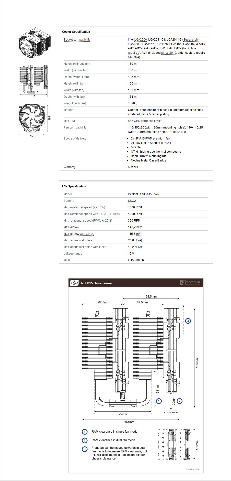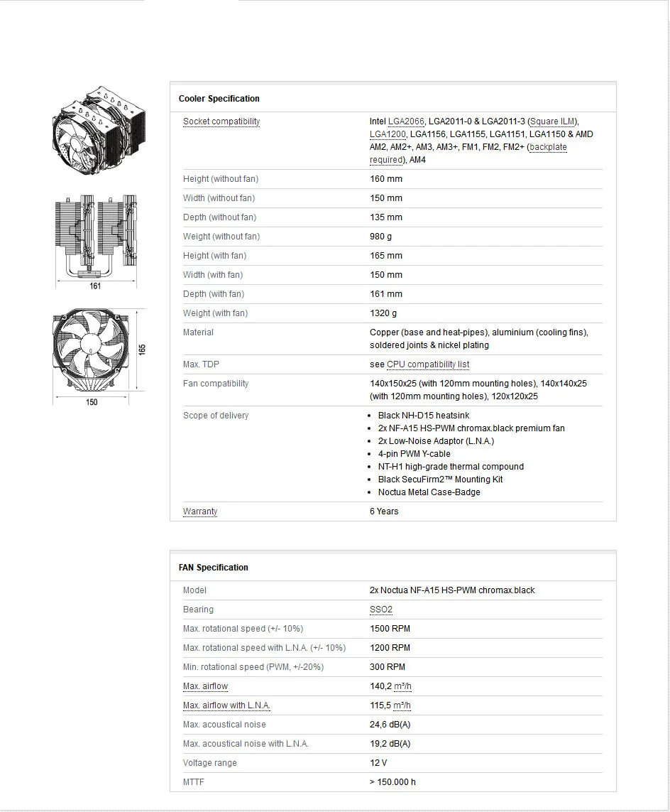 Noctua products are renowned for their impeccable quality and outstanding longevity. Like all Noctua fans, the supplied NF-A15's feature an MTTF rating of more than 150.000 hours and the entire NH-D15 package comes with a full 6-year manufacturer's warranty.