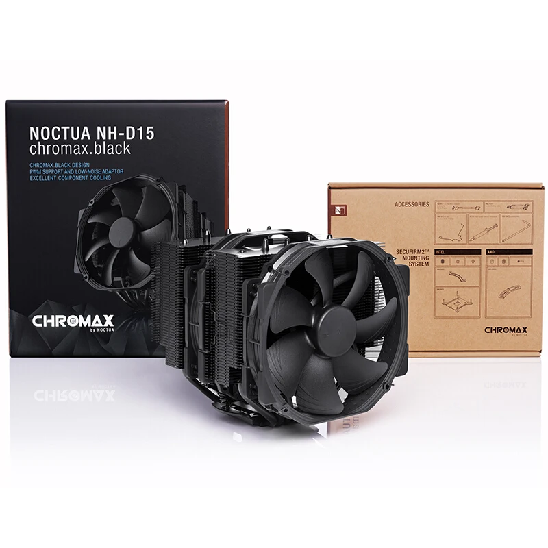 The NH-D15 chromax.black is an all-black version of Noctua’s award-winning flagship model NH-D15 premium-quality quiet CPU cooler. Thanks to the same proven dual-tower heatsink design and NF-A15 PWM fans, it stays true to the NH-D15’s successful formula of rivalling the performance of all-in-one water coolers while maintaining superb quietness of operation. At the same time, the chromax.black version with its black fans and black coated heatsink combines these assets with a sleek stealth look. Topped off with the renowned SecuFirm2™ multi-socket mounting system, Noctua’s enthusiast-grade NT-H1 thermal compound and a full 6-year manufacturer’s warranty, the NH-D15 chromax.black is a deluxe choice for both overclockers and silent enthusiasts who seek an elite-class heatsink that looks just as great as it cools.