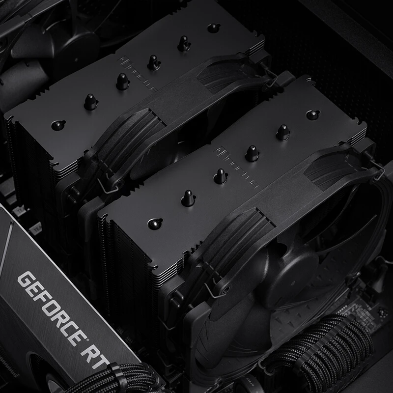 The NH-D15 chromax.black is black from head to toe: Featuring a black coated heatsink, black fans with black anti-vibration-pads, black fan clips and black mounting parts, it’s right at home in all-black builds and easy to integrate with other colour schemes.