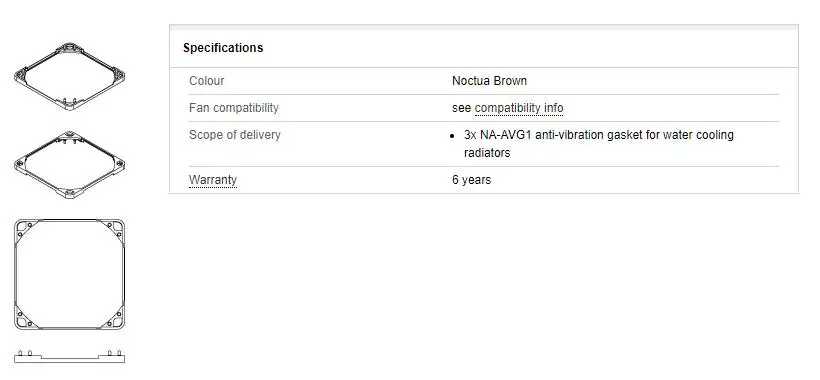The NA-AVG1 gaskets are compatible with all current Noctua 120x25mm fans, including the award-winning NF-A12x25, NF-F12, NF-S12A and NF-P12 redux series. The 120x15mm NF-A12x15 series fans are not supported.
