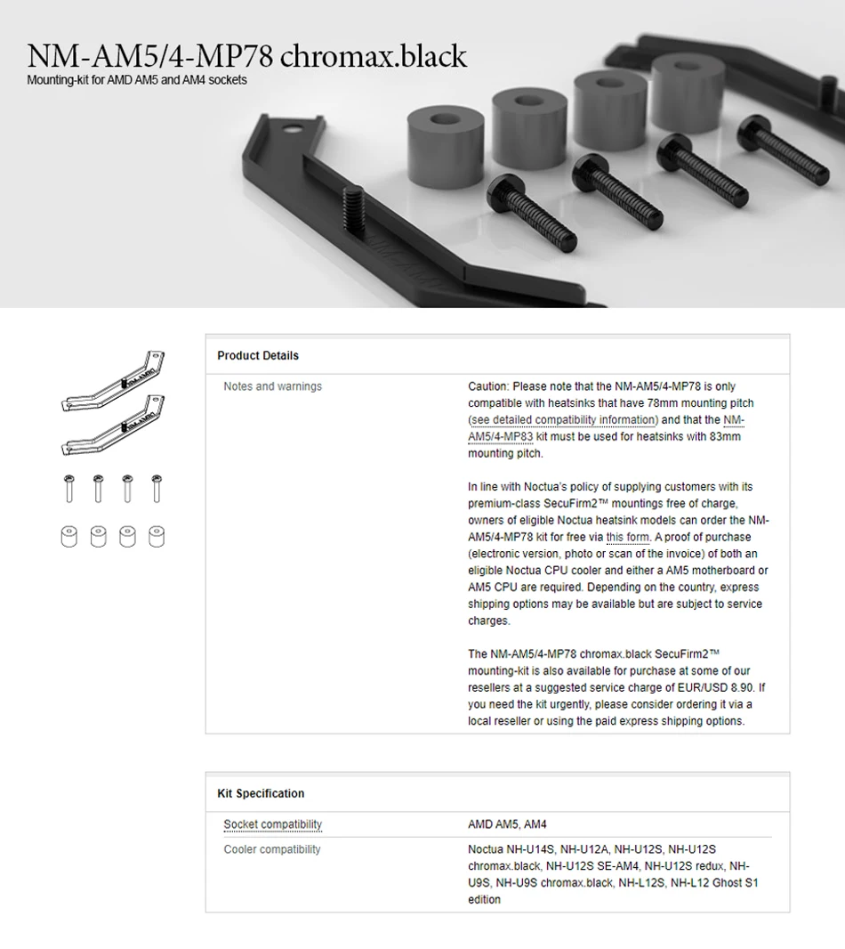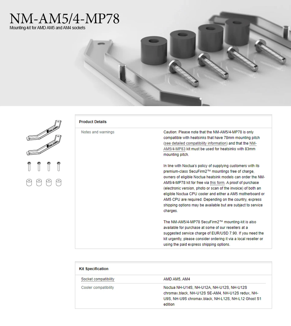 El 2/4-MP78 es un SecuFirm2 de 2/2 pulgadas.™Kit de actualización de montaje que permite actualizar los enfriadores de CPU Noctua con paso de montaje de 78mm (consulte la información detallada de compatibilidad) a las plataformas AM5 y AM4 de AMD. Fiel A LA SecuFirm2™Tradicional, combina una fiabilidad excepcional, una presión de contacto óptima y una instalación fácil y sencilla para permitir a los usuarios de Noctua seguir utilizando sus disipadores en los últimos procesadores Ryzen de AMD.