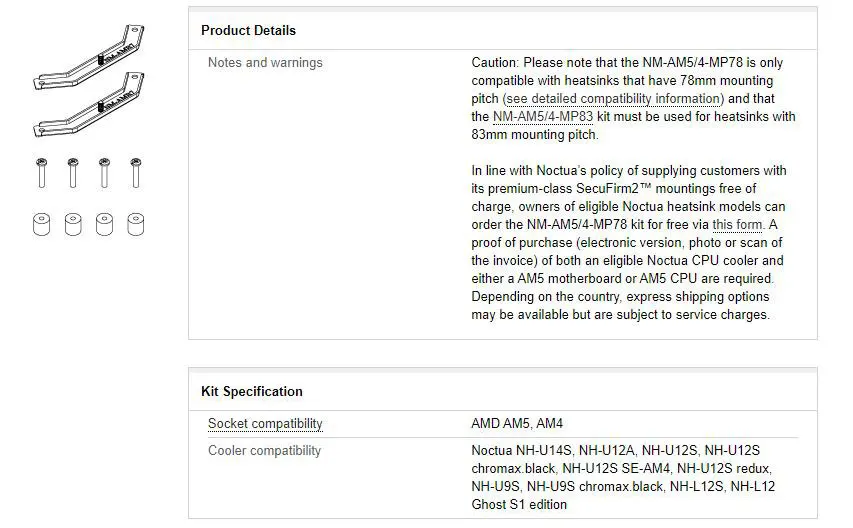 In line with Noctua’s policy of supplying customers with its premium-class SecuFirm2™ mountings free of charge, owners of eligible Noctua heatsink models can order the NM-AM5/4-MP83 kit for free via this form. A proof of purchase (electronic version, photo or scan of the invoice) of both an eligible Noctua CPU cooler and either a AM5 motherboard or AM5 CPU are required. Depending on the country, express shipping options may be available but are subject to service charges.