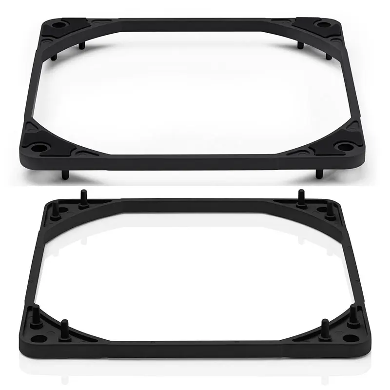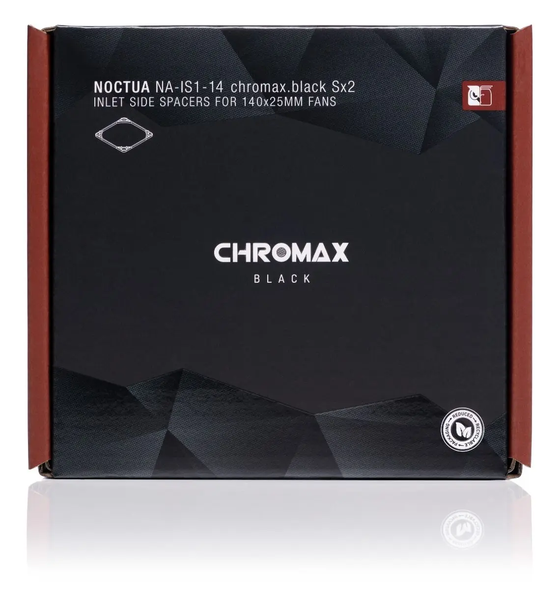 The NA-IS1-12 Sx2 is a set of two 5mm thick intake side spacer frames for Noctua 120x25mm fans that can help to improve both acoustics and performance in suction or “pull” type applications where the fan draws air through obstacles such as grills, perforated plates, mesh panels, filters or radiators. By offsetting the fan from the obstacle, the NA-IS1 inlet spacer reduces influx turbulences, which can, depending on the application and fan model, not only improve airflow but also significantly reduce overall noise levels and make the fan sound more pleasant to the ear. Designed to replace the fan’s stock NA-AVP1 anti-vibration pads, the NA-IS1-12 are compatible with all current square-frame Noctua 120x25mm fans and extremely straightforward to install: For case fan applications, either the supplied self-tapping screws or the included NA-AV3 anti-vibration mounts can be used to sandwich the spacer between the fan and the case panel. For radiator mounting, both M3 and UNC 6-32 screws are supplied. In sum, the NA-IS1-12 Sx2 set is a simple yet highly effective fine-tuning measure for suction type applications where a reduction of influx turbulence can lead to improved airflow and acoustics. The chromax.black variant is a perfect match for black chromax or industrialPPC line fans.