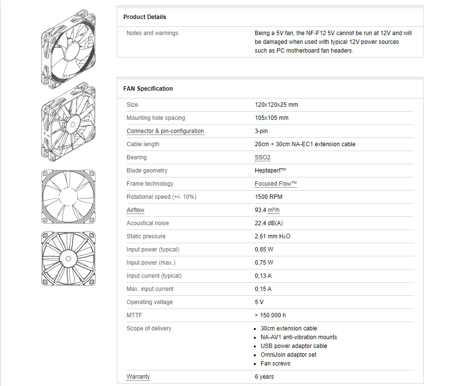 Al ser un ventilador de 5 V, el NF-F12 de 5 V PWM no puede funcionar a 12 V y se dañará cuando se use con fuentes de alimentación típicas de 12 V, como los cabezales del ventilador de la placa base de la PC.