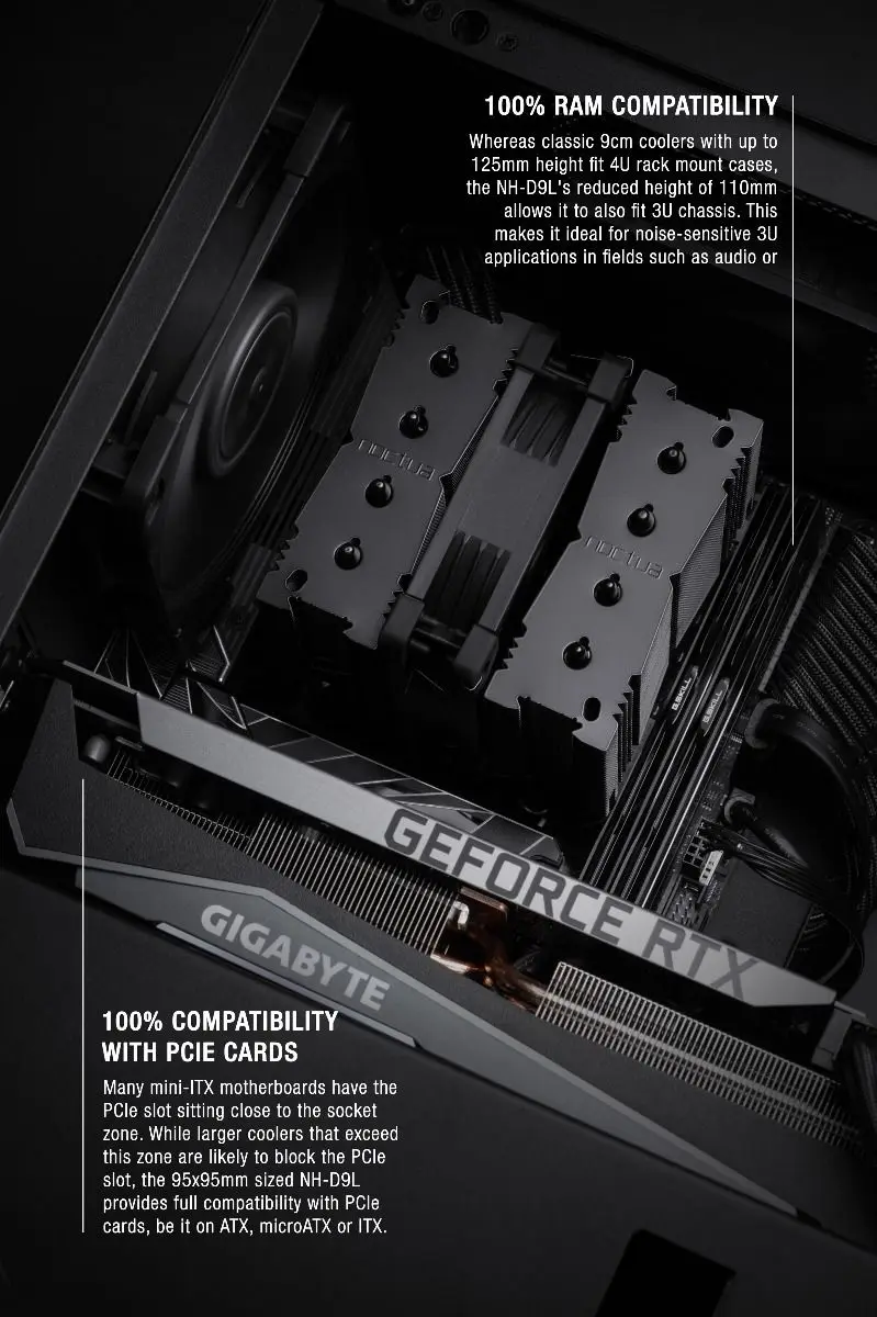 Mientras que la mayoría de los refrigeradores de perfil bajo soplan aire hacia la placa base, el NH-D9L es un refrigerador estilo torre que sopla paralelo a la placa base, lo que permite una eficiencia de flujo de aire superior en casos con ventiladores de admisión frontal y de escape trasero que crean una ruta de flujo de aire paralela a la placa base.