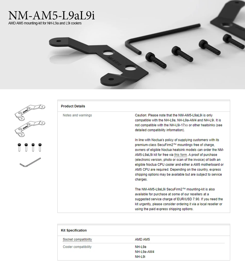 El NM-AM5-L9aL9i es un SecuFirm2™Kit de actualización de montaje que permite actualizar los enfriadores de CPU Noctua, de los tipos de CPU (ver información detallada de compatibilidad) a la plataforma AM5 de AMD. Fiel A LA SecuFirm2™Tradicional, combina una fiabilidad excepcional, una presión de contacto óptima y una instalación fácil y sencilla para permitir a los usuarios de Noctua seguir utilizando sus disipadores en los últimos procesadores Ryzen de AMD.