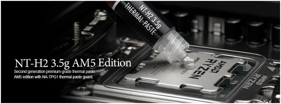 NT-H2 is the further improved second generation of Noctua’s award-winning hybrid thermal compound. Combining the iconic NT-H1’s proven features, superb ease-of-use and renowned long-term stability with a novel, fine-tuned formula of micro particles for even better thermal performance, NT-H2 is an enthusiast-grade paste for the highest demands. Whether it’s air- or water-based cooling, CPU or GPU applications, overclocking or silent systems: NT-H2 will consistently deliver outstanding results and thanks to the included cleaning wipes, it is just as easy to remove as to apply. The AM5 Edition also includes the NA-TPG1 thermal paste guard that prevents thermal paste build-up in the cut-outs of the heatspreader of AMD AM5 CPUs – a simple yet highly effective means to keep your AM5 processor clean.