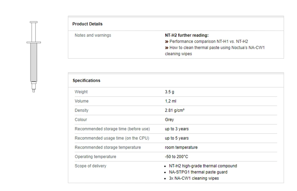 Noctua’s NT-H1 is a renowned hybrid thermal compound that has received more than 150 awards and recommendations from international hardware websites and magazines. Thanks to its excellent performance, exceptional ease of use and outstanding long-term stability, it has become an established favourite among overclockers and enthusiast users worldwide. Whether it’s air- or water-based cooling, CPU or GPU applications, overclocking or silent systems: NT-H1 is a proven premium paste that’s guaranteed to deliver great results. The SW (Spatula & Wipes) Edition includes a spatula for users who prefer to manually spread the paste before installing the heatsink as well as three NA-CW1 cleaning wipes for pre-application cleaning and easy removal.