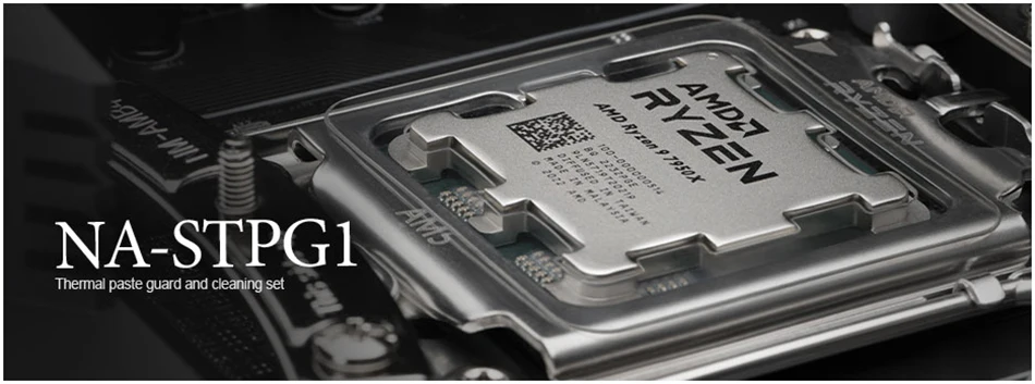 The NA-TPG1 is a simple yet highly effective means to preclude thermal paste build-up in the cut-outs of the heatspreader of AMD AM5 CPUs. When the mounting pressure of the cooling solution is applied, excess thermal paste will be squeezed outwards. With AM5 CPUs, this excess paste tends to accumulate in the cut-outs at the sides of the heatspreader and may become difficult to remove. Simple and risk-free to apply, the NA-TPG1 prevents this undesired phenomenon. Combined with the ten included NA-CW1 cleaning wipes, the NA-STPG1 set gives you everything you need to keep your AM5 processor clean.