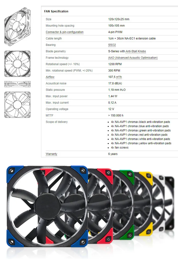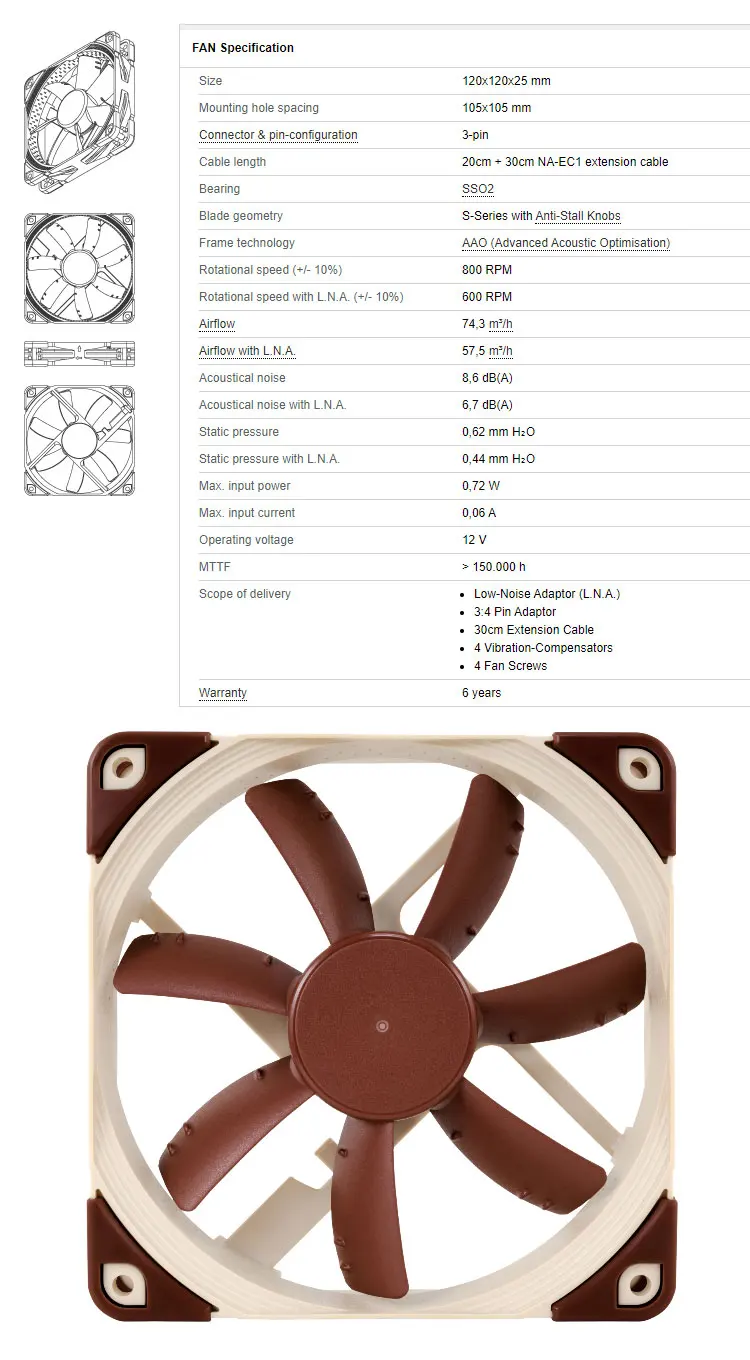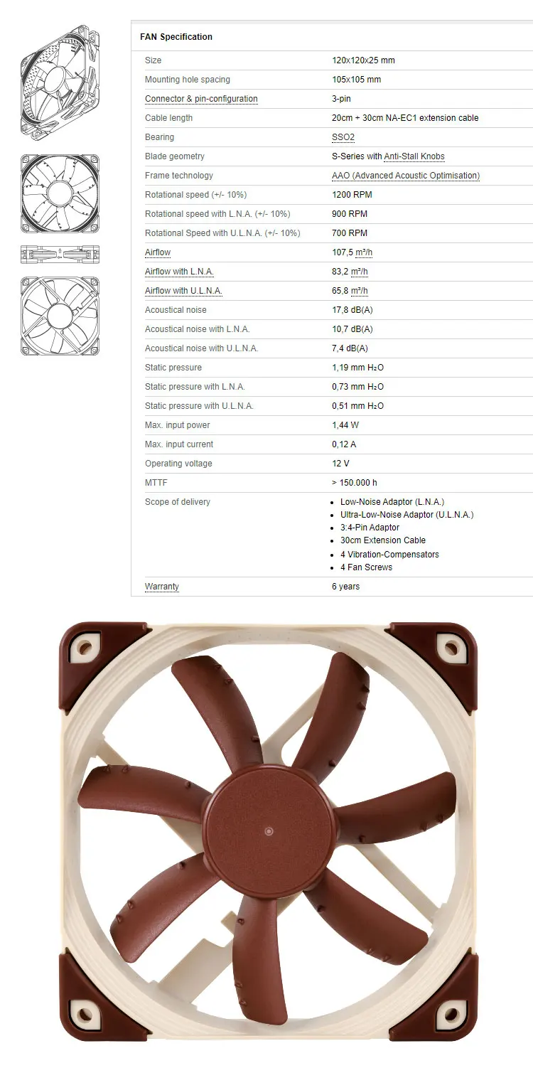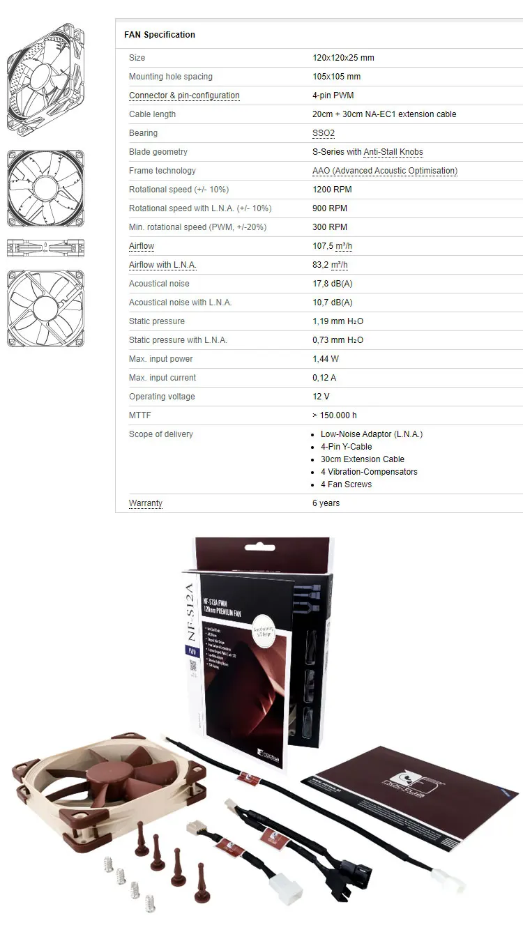 Noctua-ventilador de CPU con Control inteligente de temperatura, dispositivo de 4 pines, PWM/3 pines, 120x120x25mm, adaptador de bajo ruido, optimización acústica AAO, NF-S12A