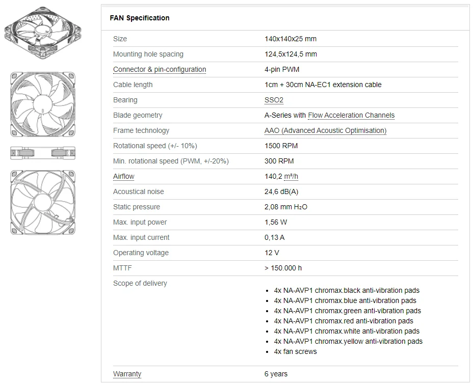 Después de haber recibido más de 100 premios y recomendaciones de sitios web y revistas internacionales de hardware, la marca Noctua es uno de los ventiladores de 140mm más reconocidos y populares de la marca. Su marco cuadrado lo hace ideal para usar en radiadores de refrigeración por agua o como ventilador de carcasa. El cromax. Negro. La Edición de intercambio combina el rendimiento de enfriamiento silencioso de la firma del NF-A14 con un atractivo diseño completamente negro y un paquete de rojo, blanco, azul, verde intercambiable. Almohadillas antivibración amarillas y negras que permiten personalizar el color del ventilador para que coincida con los esquemas de color de construcción individuales. Para una mayor personalización, una amplia gama de accesorios, como cables de colores, almohadillas antivibración adicionales y soportes antivibración, están disponibles por separado. Completado con el rodamiento SSO2 de primera calidad de confianza de Noctua, más de 150.000 horas de MTTF y 6 años de garantía del fabricante, el chromax PWM DE LA NF-A14. Negro. swap es la elección perfecta para todos los usuarios que valoran la estética de construcción individual y enfocada tanto como la calidad y el rendimiento líderes en su clase.