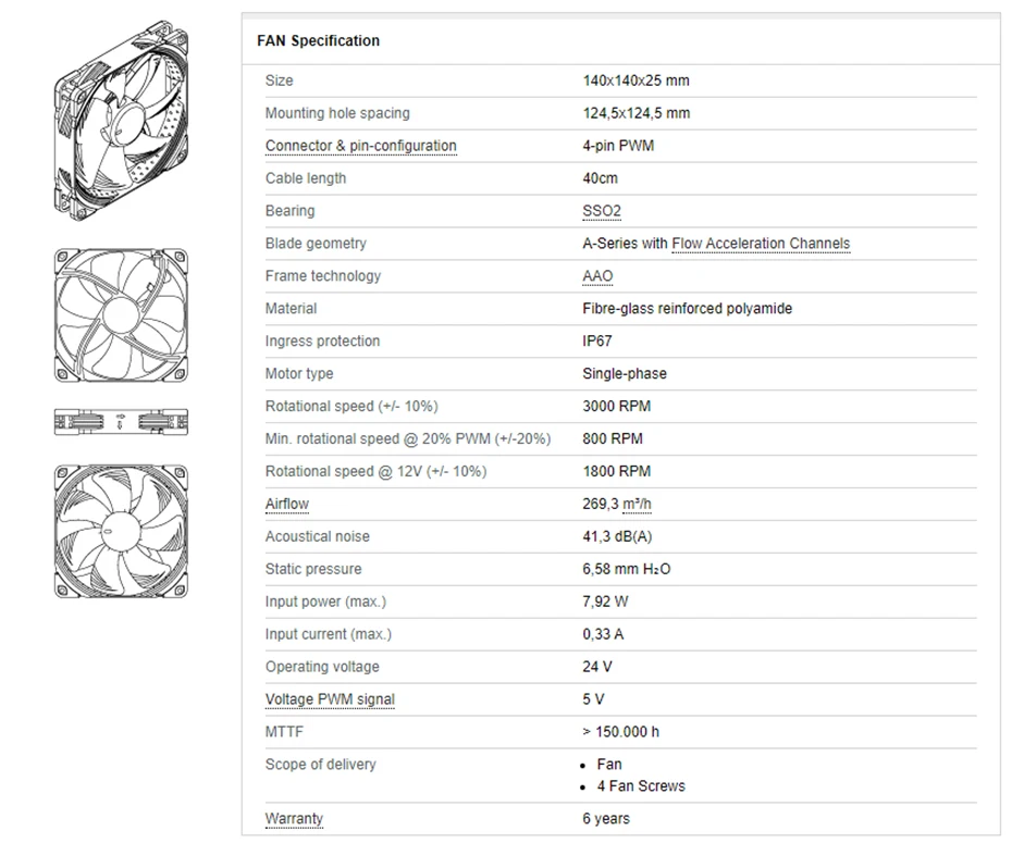 Concebido para aplicaciones industriales de servicio pesado que requieren un rendimiento de refrigeración mejorado y una protección avanzada de entrada, el industrial PPC (refrigeración de rendimiento protegido) de es una versión robusta de alta velocidad del galardonado modelo minorista. La variante 24V SP utiliza el nuevo controlador de motor monofásico de alta eficiencia IC de Noctua para admitir aplicaciones industriales y automotrices basadas en 24V. Su sofisticada supresión de la corriente de entrada y su extrema robustez eléctrica con inmunidad prolongada a explosiones y sobretensiones le permiten operar de manera segura en entornos electrónicos sensibles u hostiles. Gracias a la excelente eficiencia aerodinámica del diseño de la NF-A14 y al motor monofásico de alto rendimiento, la versión industrial PPC SP proporciona una capacidad de flujo de aire y presión superior al tiempo que mantiene el ruido y el consumo de energía a un nivel moderado en comparación con los ventiladores de alta velocidad comparables. Si bien su construcción de poliamida reforzada con fibra de vidrio y la protección certificada contra el agua y el polvo hacen que el PPC industrial de la sea adecuado para el funcionamiento en entornos desafiantes, la reconocida tecnología de rodamientos SSO2 garantiza un MTTF de más de 150.000 horas. Con la fiabilidad de confianza de Noctua y la garantía del fabricante de 6 años, el industrial PPC de la marca Noctua, es una opción ideal para aplicaciones altamente exigentes que requieren caudales superiores y la máxima fiabilidad.