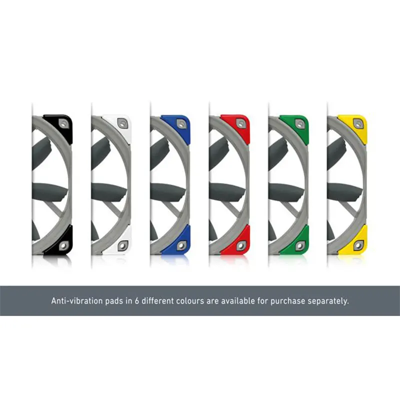 The fan’s frame can be outfitted with Noctua’s chromax line NA-SAVP1 anti-vibration pads. Available in black, red, blue, white, green and yellow, these pads not only damp minute vibrations but also allow the fan to be colour-customised in order to coordinate it with popular build colour schemes!