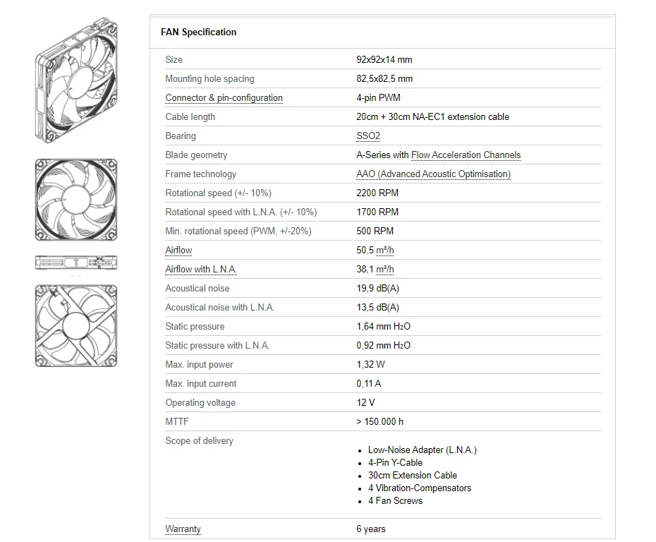 Con el marco AAO de Noctua y las sofisticadas medidas de diseño aerodinámico, como los canales de aceleración de flujo, el ventilador de alta calidad, altamente optimizado y silencioso, con un tamaño de 92x14mm. Debido a su grosor de solo 14mm, el NF-A9x14 es una combinación perfecta para los enfriadores de CPU de bajo perfil y todas las demás aplicaciones que requieren ventiladores más delgados. El PWM IC de Noctua diseñado a medida para control de velocidad totalmente automático y rodamientos de clase de referencia SSO2 garantizan una suavidad de funcionamiento excelente y una excelente estabilidad a largo plazo. Rematado con cableado modular, un adaptador de bajo ruido y 6 años de garantía del fabricante, el NF-A9x14 es una opción premium para las más altas exigencias.