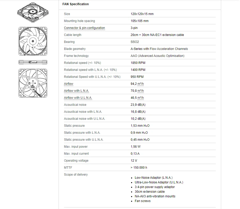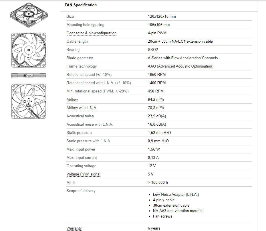 Con medidas avanzadas de diseño aerodinámico, como los canales de aceleración de flujo y el Marco AAO de Noctua, El NF-A12x15 es un ventilador silencioso de calidad premium altamente optimizado en tamaño 120x15mm. Su diseño delgado de 15mm hace que el NF-A12x15 sea ideal para aplicaciones con espacio limitado, como enfriadores de CPU de bajo perfil o carcasas HTPC. La versión PWM tiene el circuito integrado de Noctua de diseño personalizado para un control de velocidad totalmente automático a través de cabezales de ventilador de 4 pines y viene con un adaptador de bajo ruido para reducir la velocidad máxima durante el control PWM desde 1850 a 1400rpm. Su excelente suavidad de funcionamiento, el rodamiento SSO2 de clase de referencia y la calidad premium confiable de Noctua lo convierten en una opción de élite para las más altas exigencias.