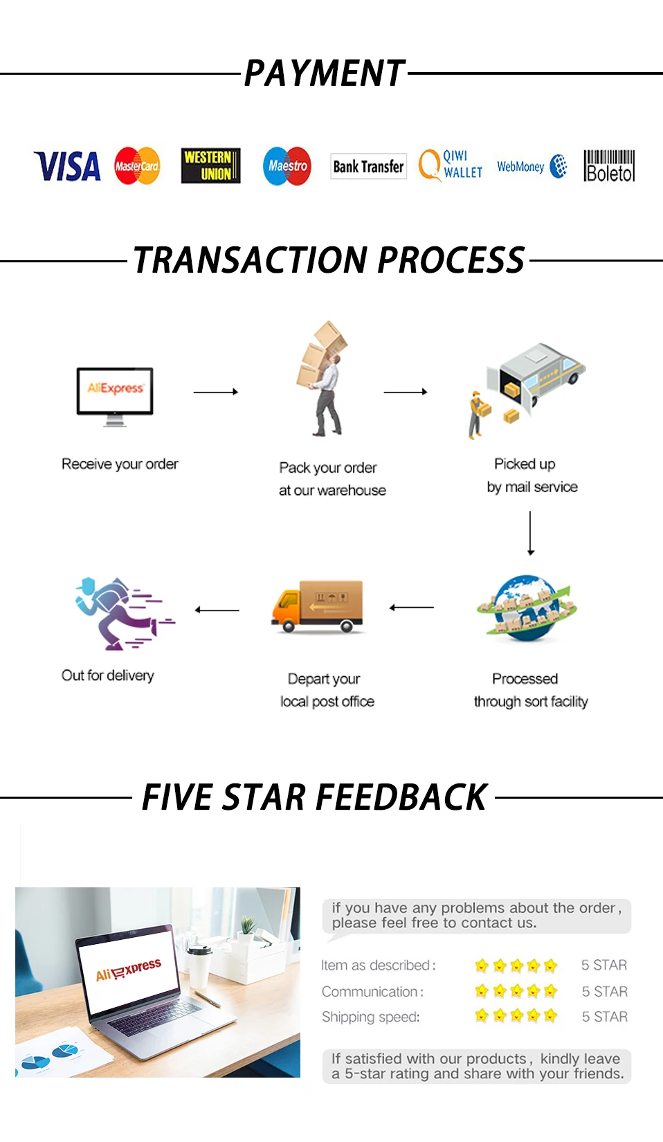 (1). All products will be checked strictly before shipping. We ship to Aliexpress's address ONLY.