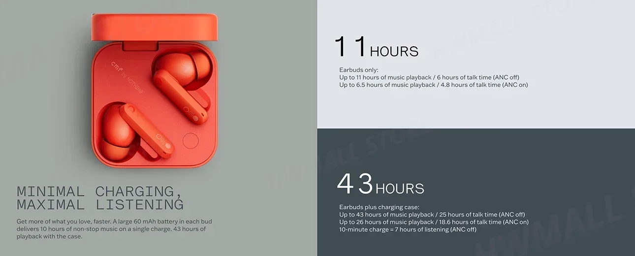 ANC ON - 10 min de carga por 1,8 h (solo gorros), hasta 6 horas (con estuche)