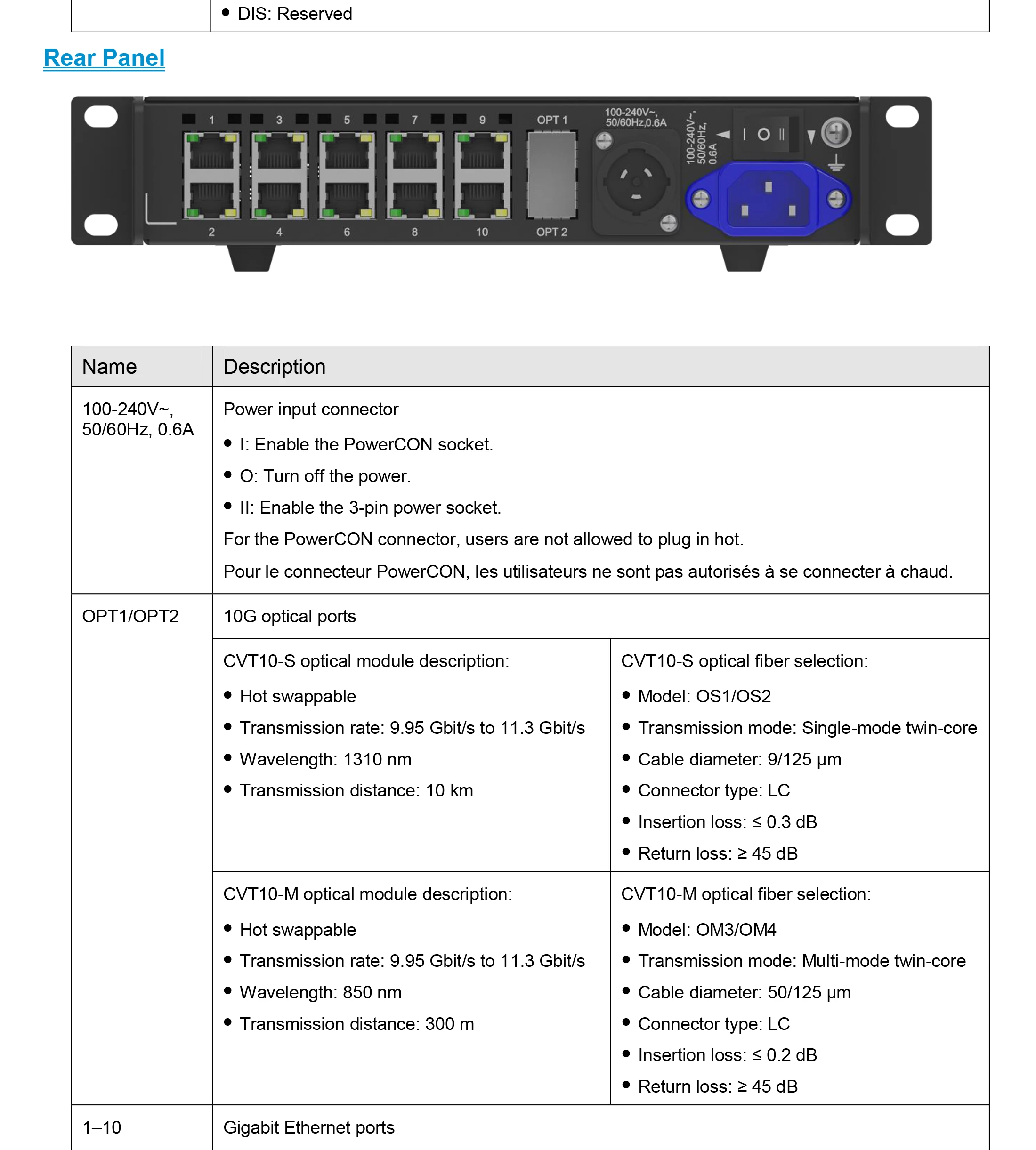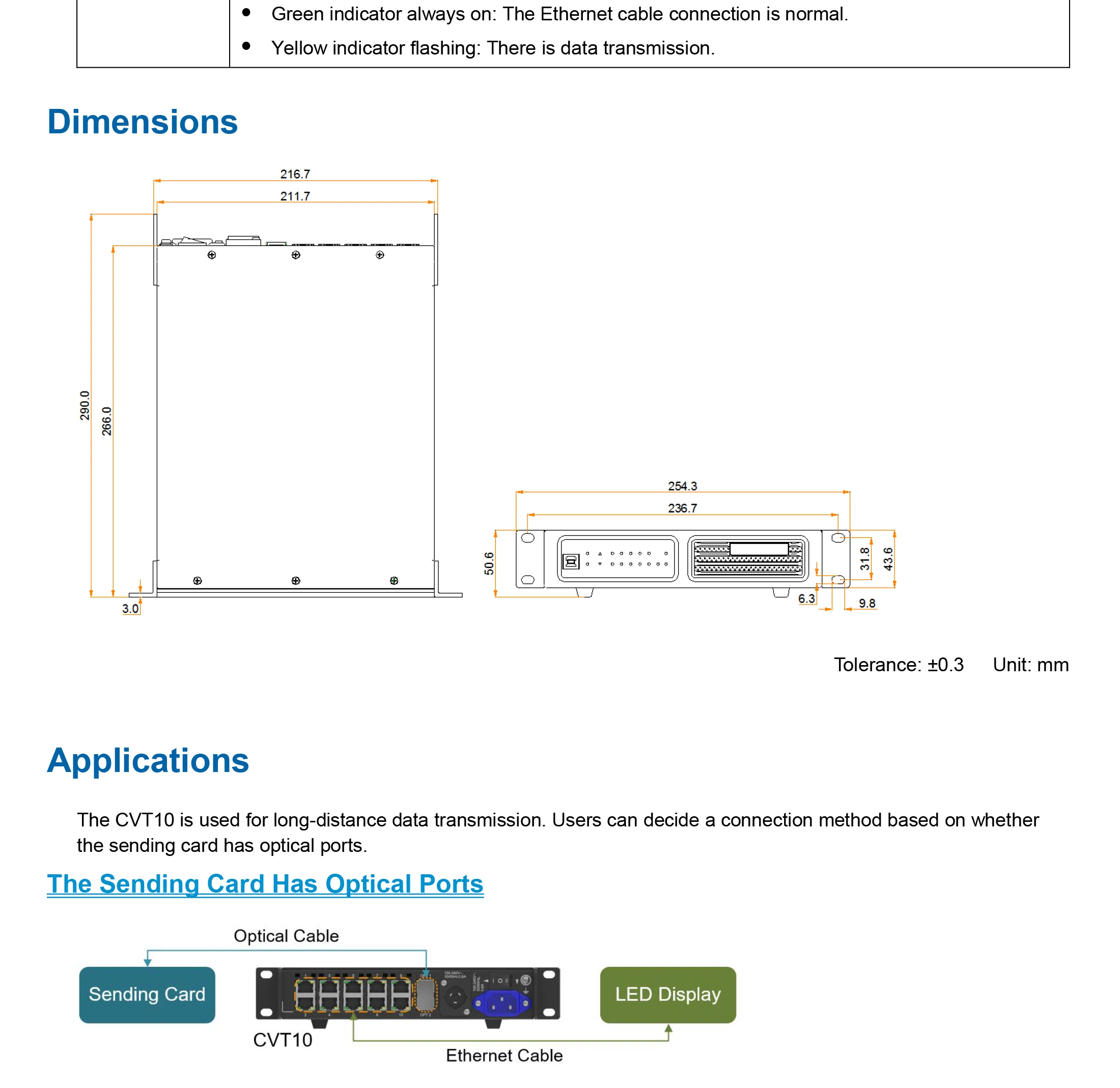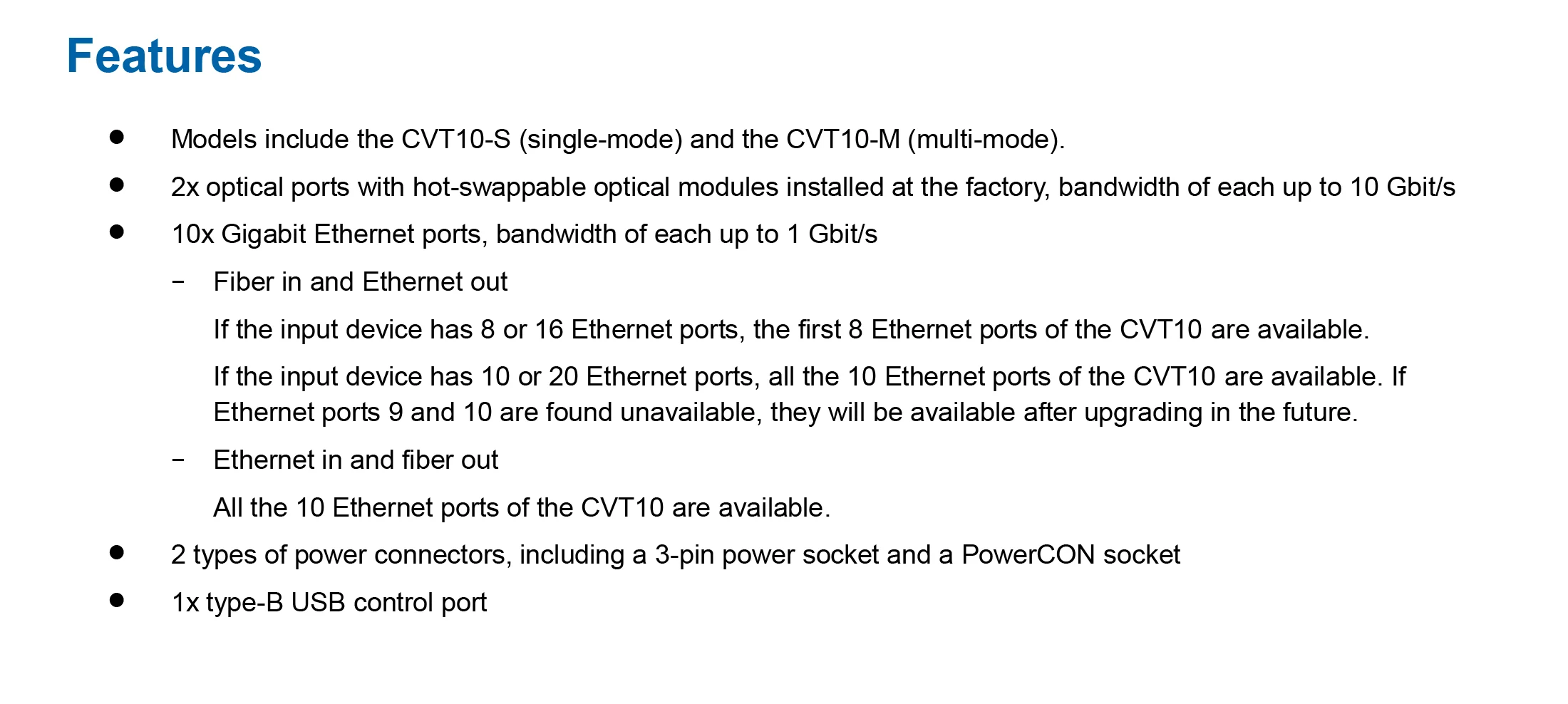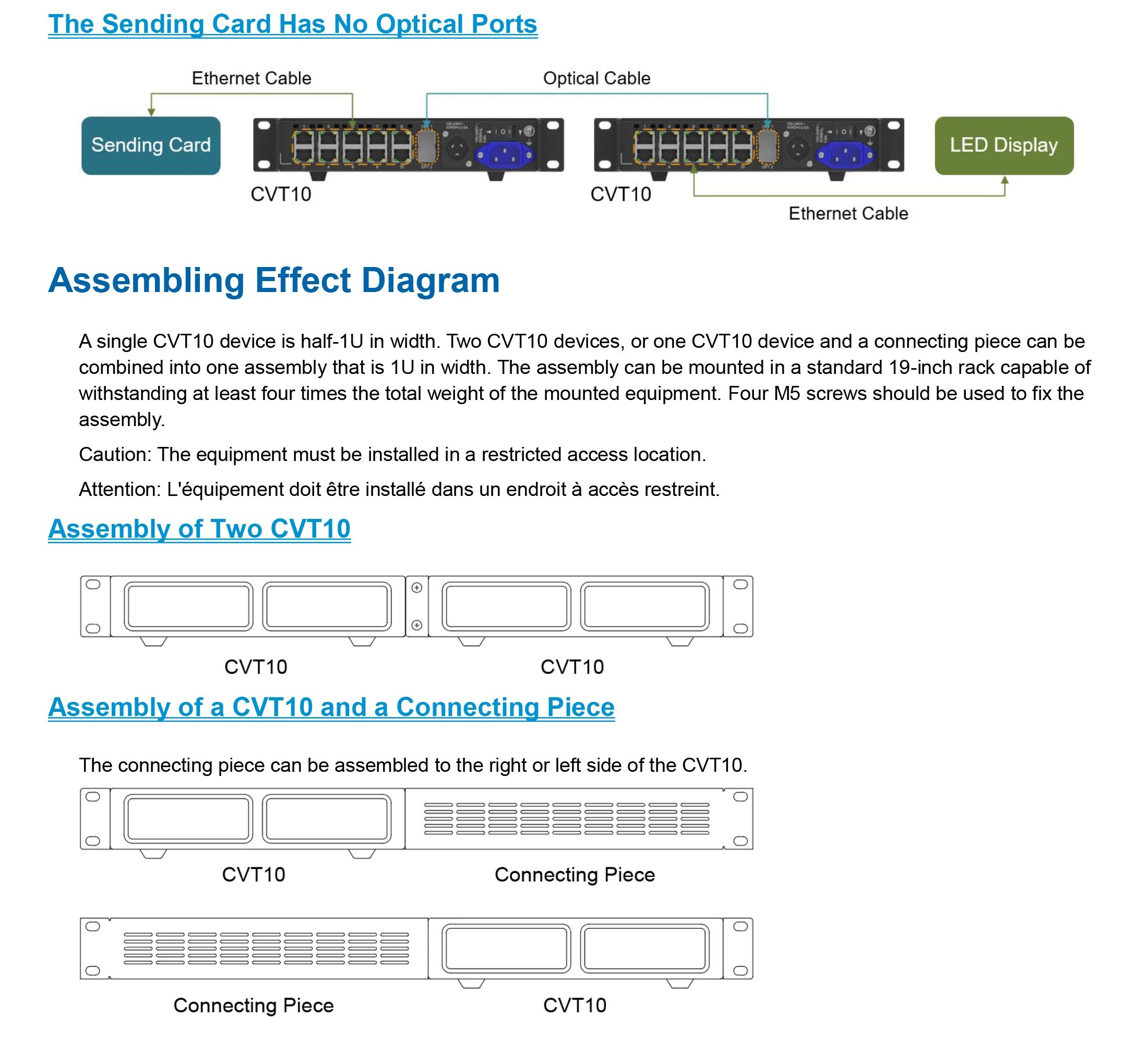 El diseño del hardware CVT10 se centra en la practicidad y la comodidad de la instalación in situ. Se puede montar horizontalmente, de forma suspendida o en bastidor, lo que es fácil, seguro y fiable. Para el montaje en rack, se pueden combinar dos dispositivos CVT10 o un dispositivo CVT10 y una pieza de conexión en un conjunto de 1U de ancho.