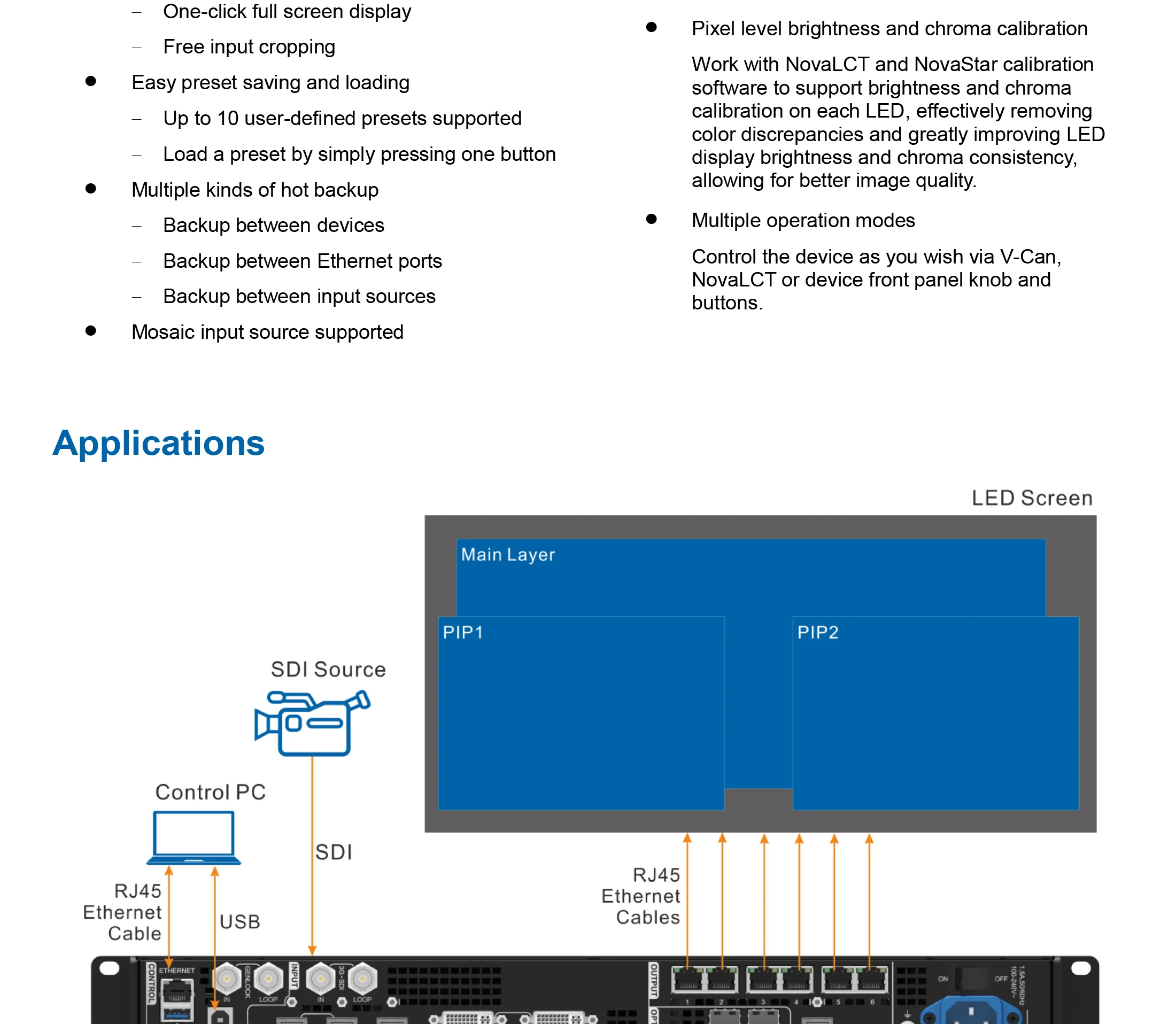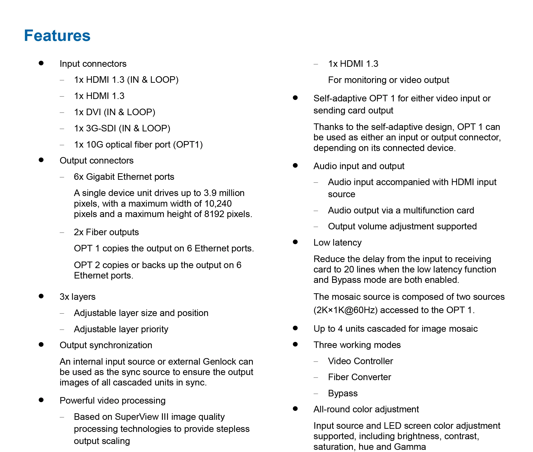 Conduce hasta 3,9 millones de píxeles, con el ancho y la altura máxima de salida hasta 10.240 píxeles y 8192 píxeles respectivamente, lo que es ideal para pantallas LED ultraanchas y ultraaltas.
