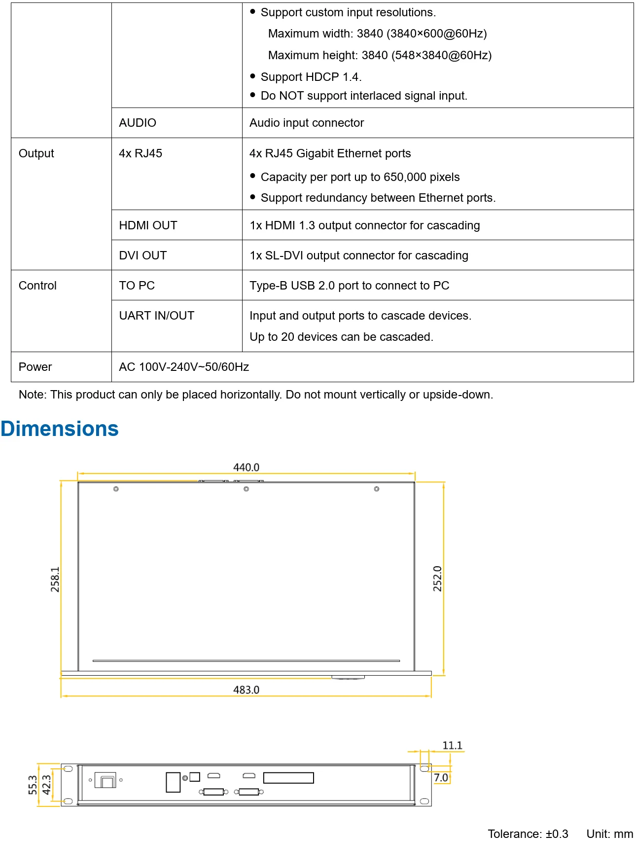 Entrada de audio y 4x salidas Ethernet. Un solo dispositivo MCTRL660 admite resoluciones de entrada de hasta 1920 × 1200 @ 60Hz.