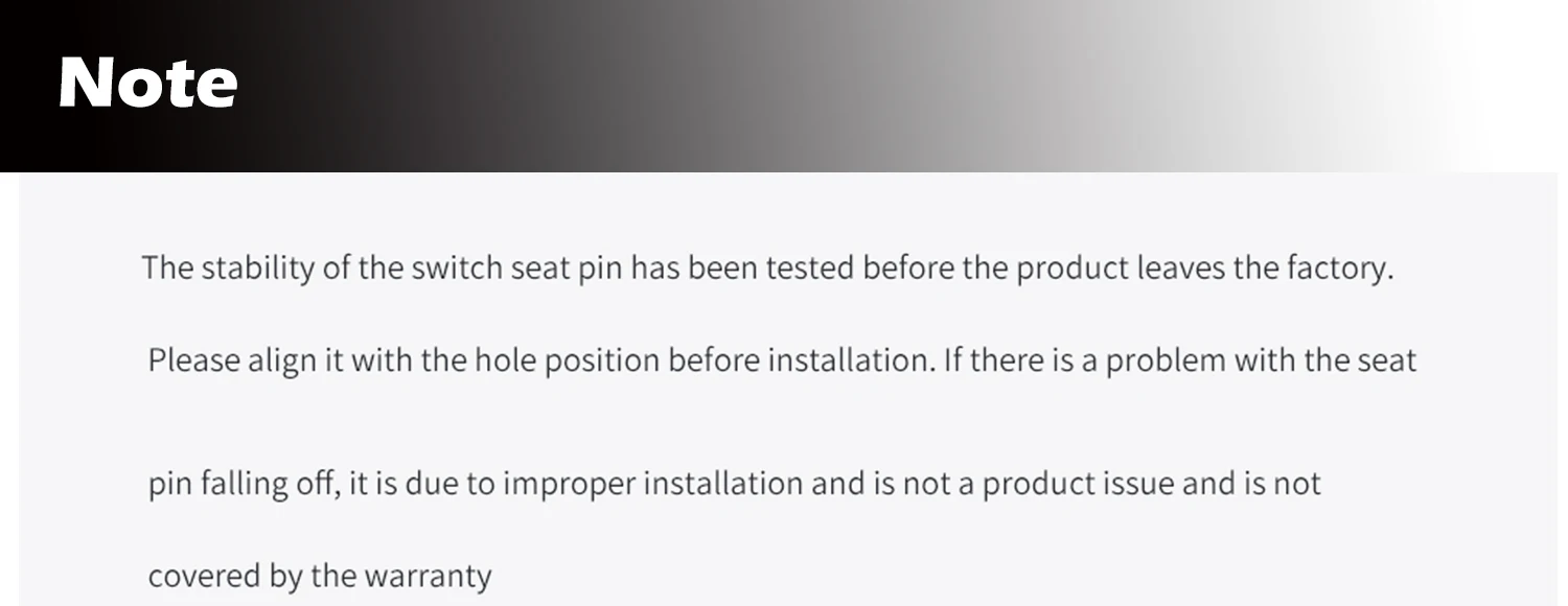 Answer: After receiving the product, please place a switch on top of the seat pin and do not install it yet. Let the pin contact the seat pin to check for work. Once there is work, insert the switch again