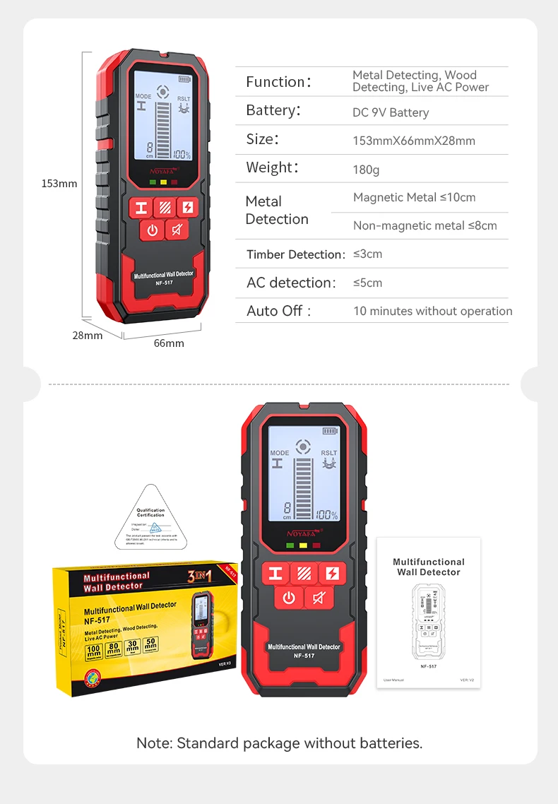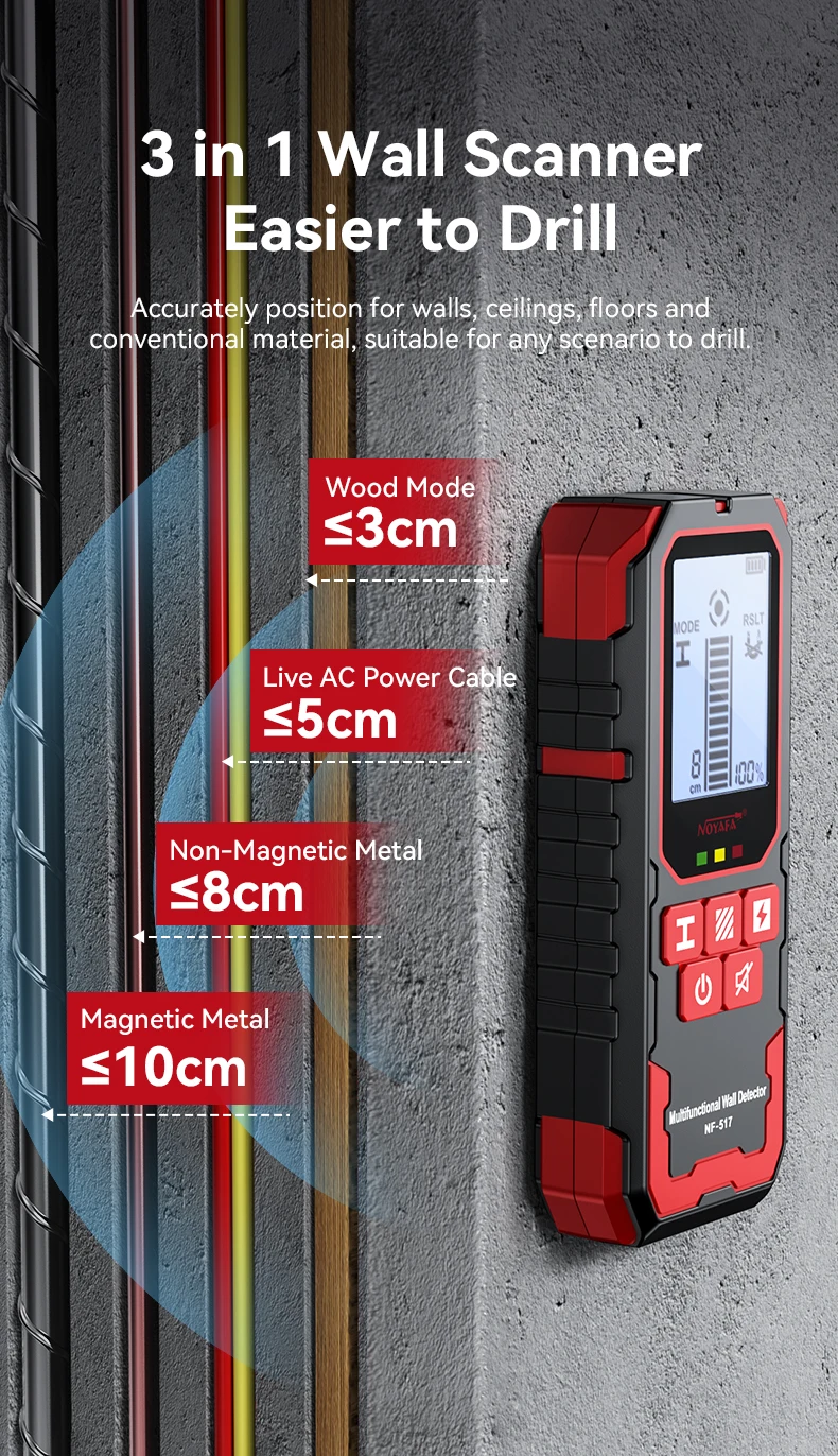 3.Medición de profundidad: alambre de madera (30 mm)/vendido (CA) (50 mm)/metal no magnético (80 mm)/metal magnético (100 mm)