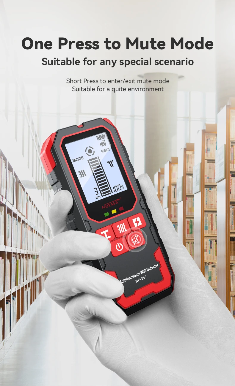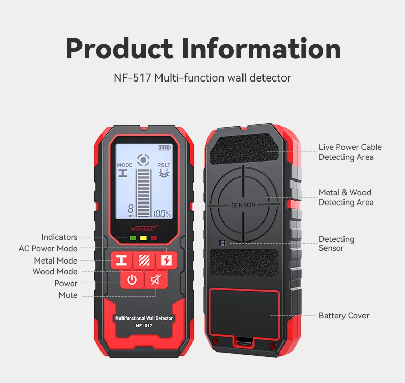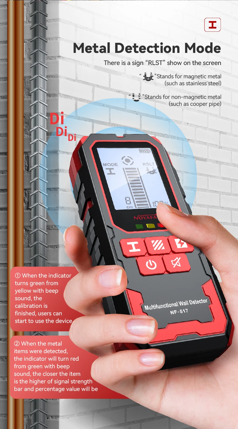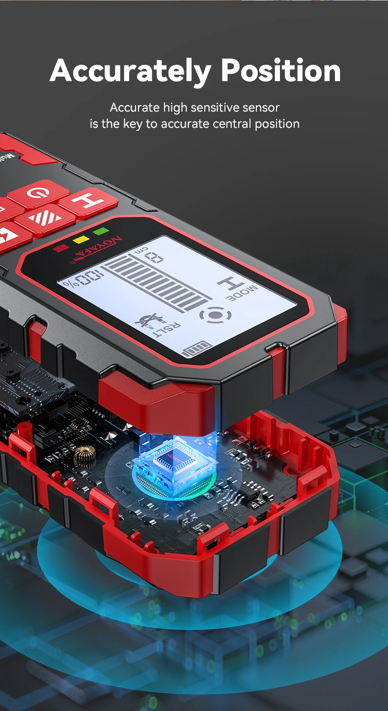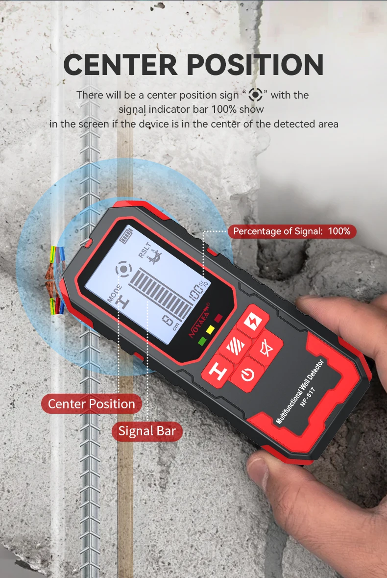 1.Detección de metales (barril de refuerzo, tubería de cobre), cable vivo, posición de costillas y ranuras debajo de paredes de madera, etc. ocultos en paredes, techos y pisos.