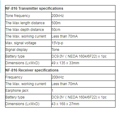 Funciones principales: 1. Localiza el camino de los cables no energizados detrás de las paredes y bajo tierra. 2. También capaz de localizar un disyuntor específico, localizar cables antes de perforar y verificar los sitios de excavación subterráneos. 3. Los cables de la pinza de contacto están disponibles para conectar el transmisor al cable eléctrico, CATV coaxial, caídas telefónicas, ires de control de riego o tuberías metálicas. 4. El rango efectivo es de hasta 0,5 m y hasta 500m de longitud.