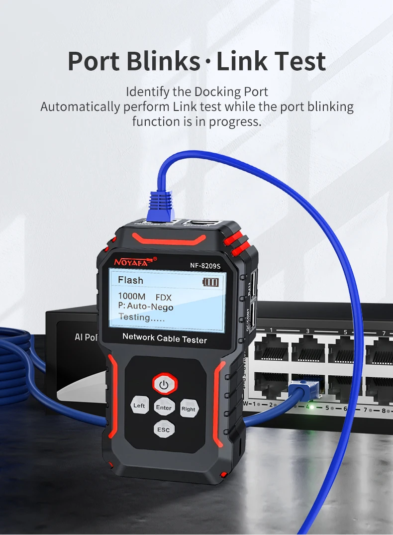 5. Función intermitente del puerto/prueba de enlace:Encuentre rápidamente el cable de red en el conmutador/ENRUTADOR. (Prueba de enlace: la prueba de enlace se realiza automáticamente mientras el puerto está parpadeando, y la pantalla mostrará la velocidad del conmutador/ENRUTADOR, dúplex completo/semidúplex, negociación automática/Negociación forzada.