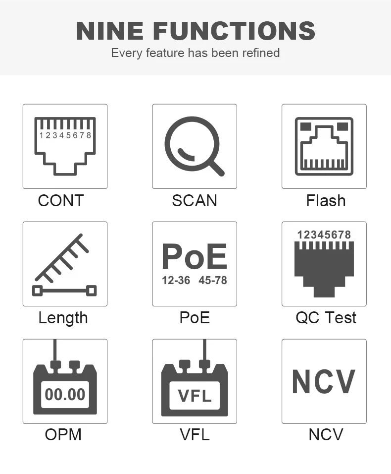 Función de prueba del transmisor: incluye prueba de continuidad del cable, escaneo del cable, parpadeo del puerto, medición de longitud del cable, prueba PoE, prueba QC para cabezal de cristal, OPM (medidor de potencia óptica) Y FUNCIÓN VFL (ubicación visual de fallas).
