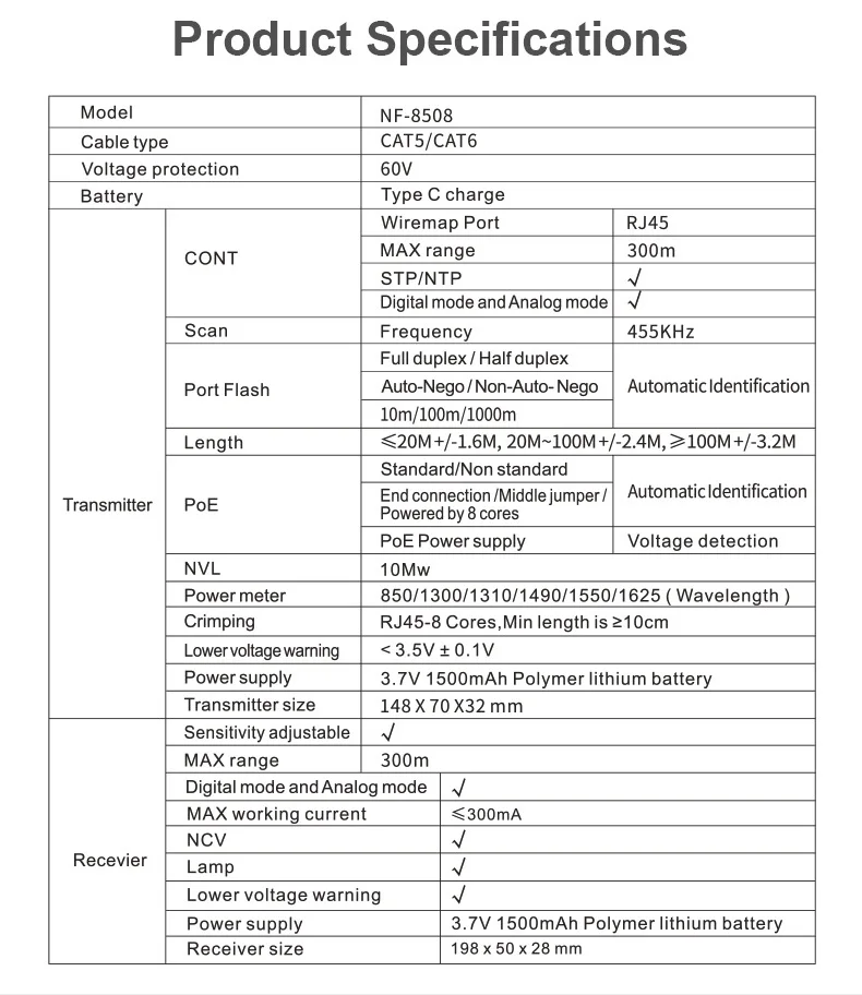 Función del receptor: ajuste de sensibilidad, cable de red blindado sin carga de 300m/cable de red blindado no vacío, detección de NCV, función de iluminación, etc.