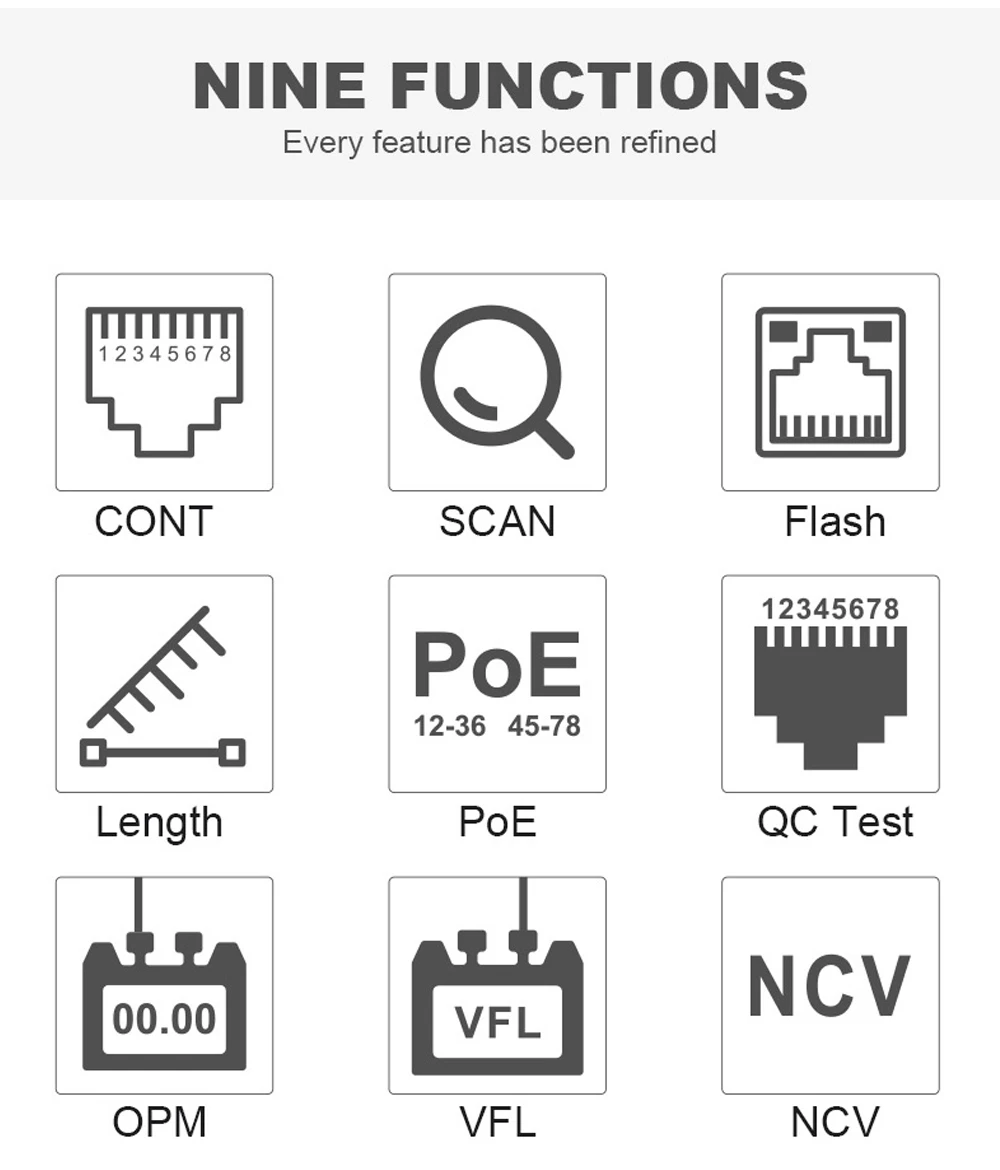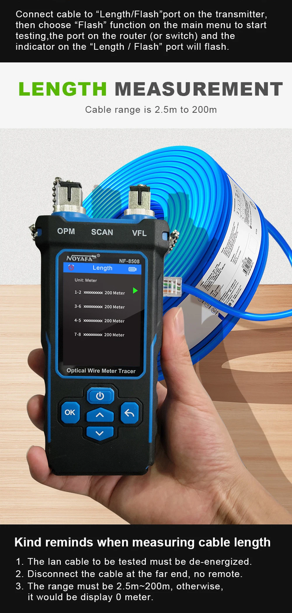 4. Medida de longitud: mide la longitud del cable CAT5, CAT6 con precisión, el rango es de 2,5 m ~ 200m.