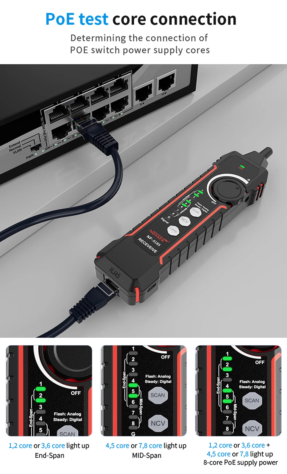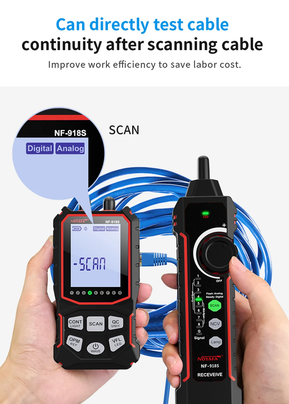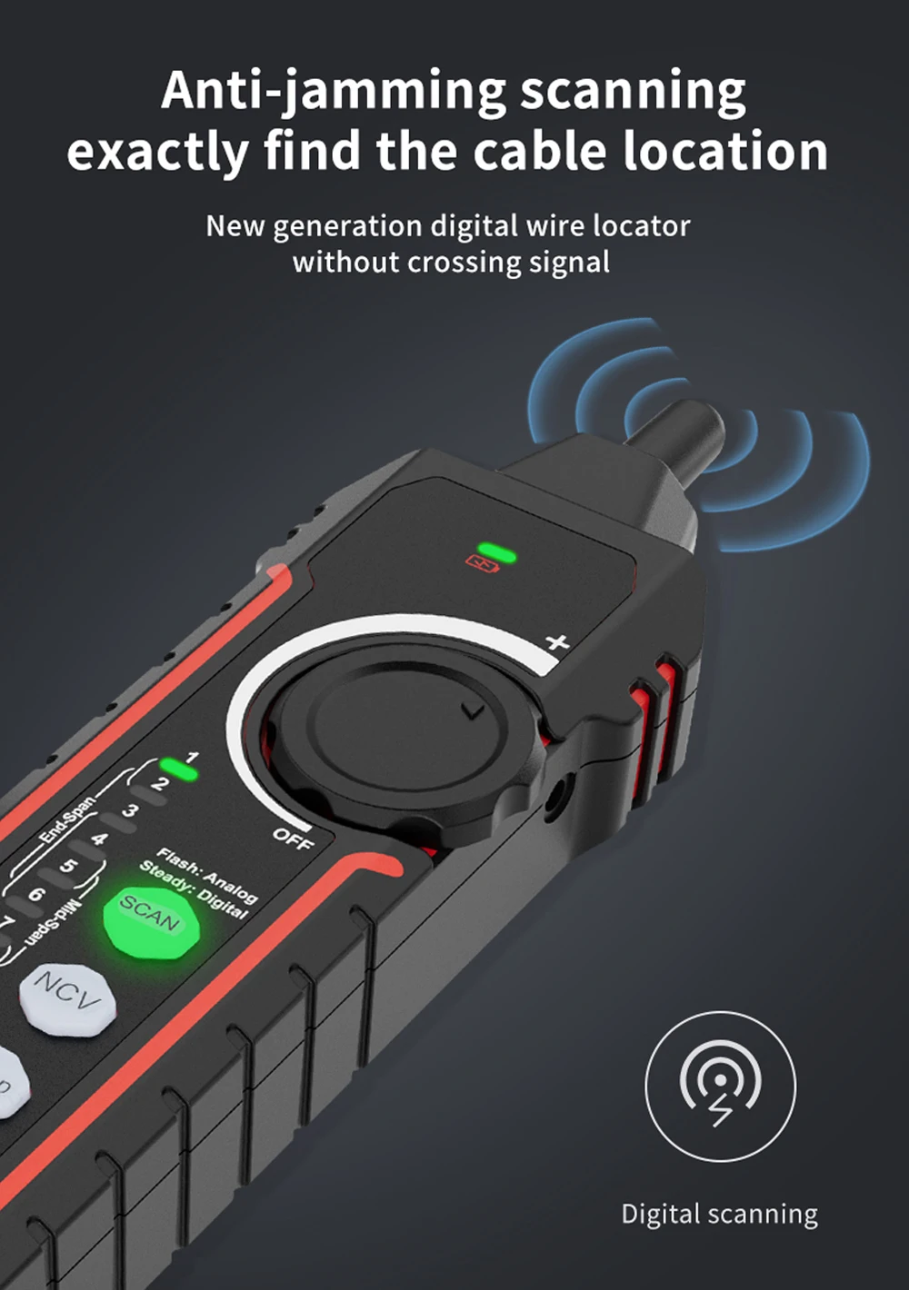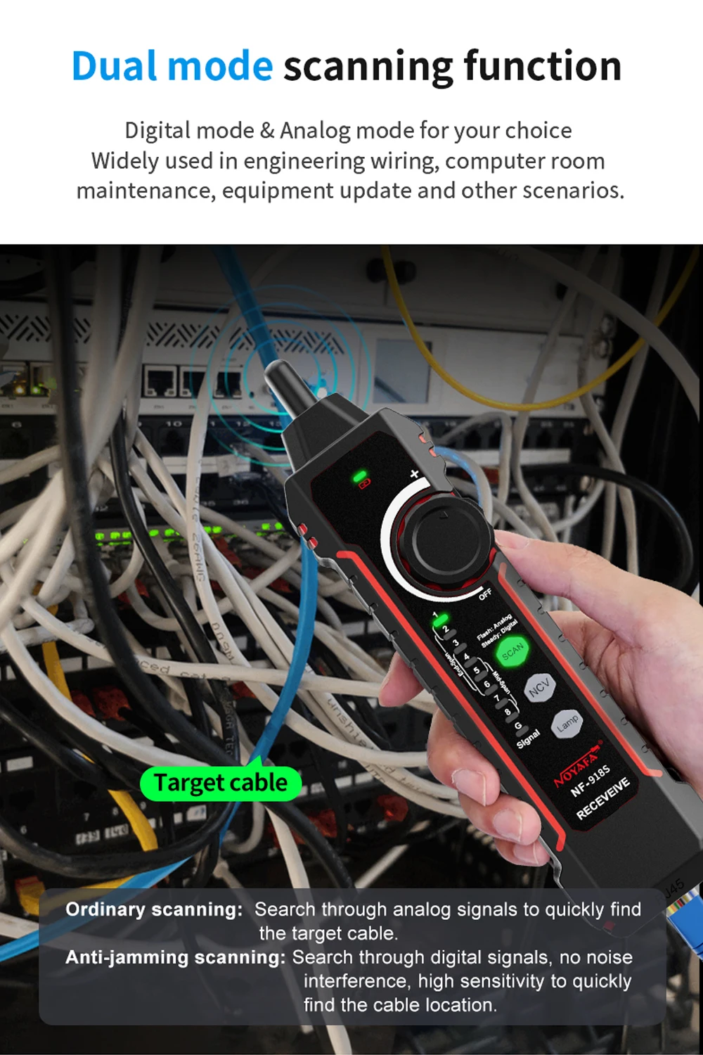 1.【Dos modos de escaneo seleccionables】 Modo normal/modo antiinterferencias. Localice el cable de red de destino entre muchos cables de red.