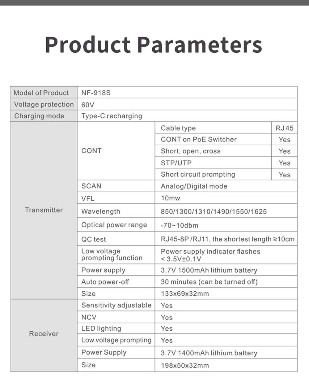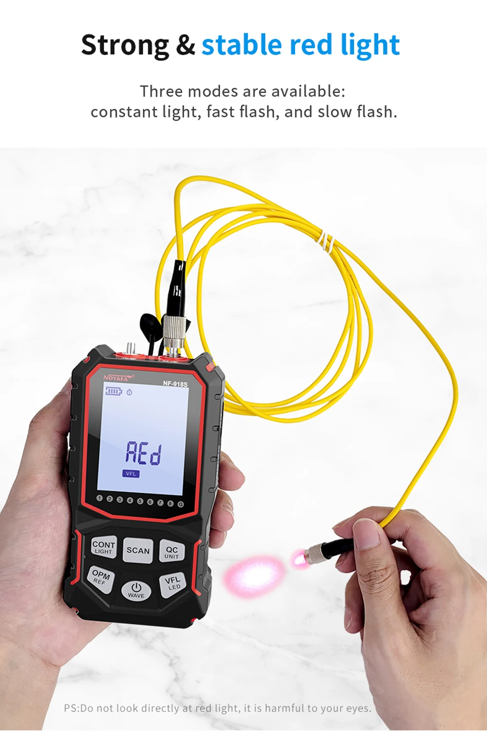 5. 【Medidor de potencia óptica】 NF-908S puede probar la potencia óptica y el valor de atenuación de la luz.La longitud de onda se puede cambiar hacia adelante y hacia atrás: 850/1300/1310/1490/1550/1625 nm.