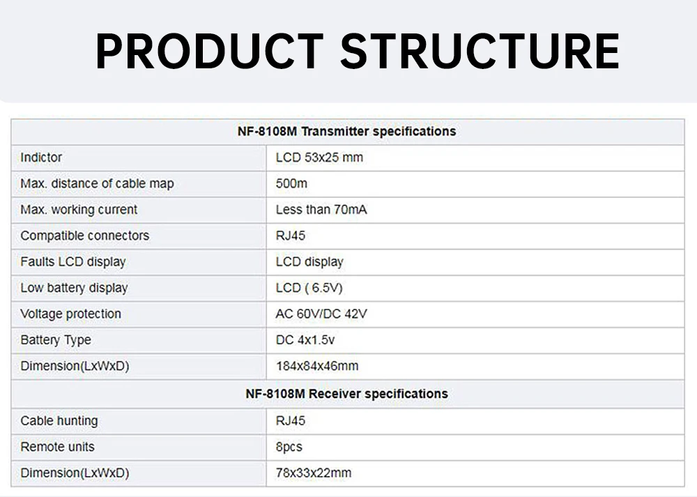 El comprobador de cable de red de se compone de probador principal y prueba de extremo lejano. Puede probar el cable para cables de red trenzados gemelos STP/UTP y verificar los errores de cable como circuito abierto, cortocircuito, conexión inversa, cruce o interferencia cruzada.